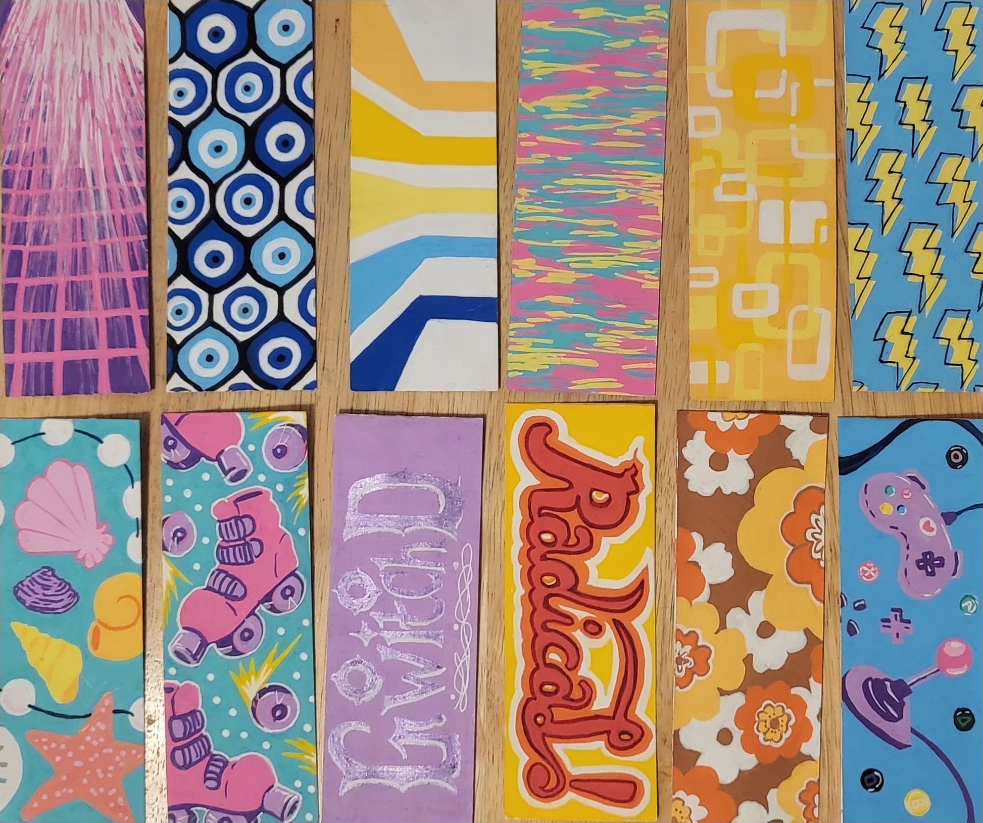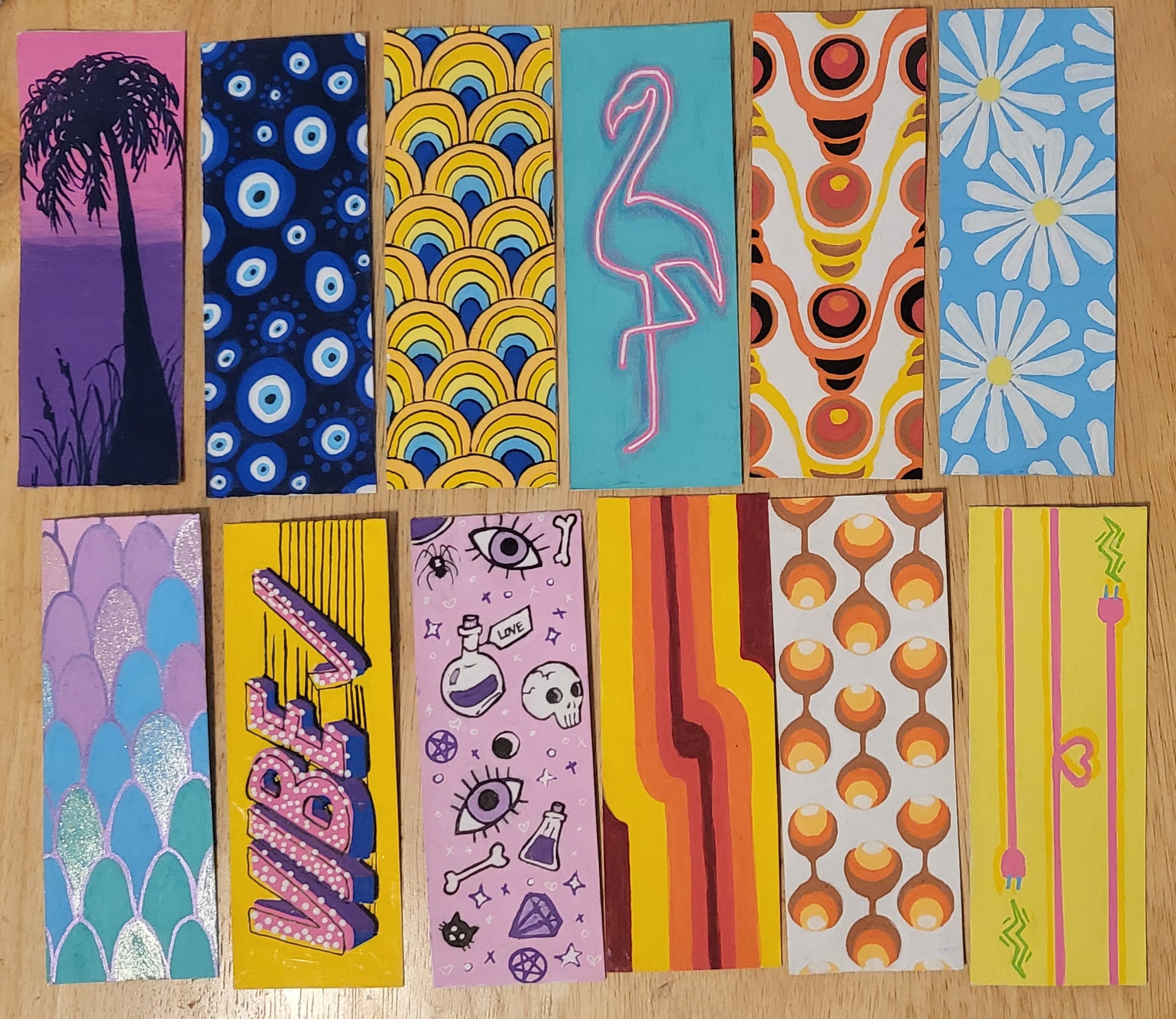 Each one has an original painting on each side so technically, there's 24 paintings in total. They're all comprised of double layered cardstock with POSCA paint and sealed with modpodge. (the one on the bottom left with the mermaid scales also has some glitter pens involved.)