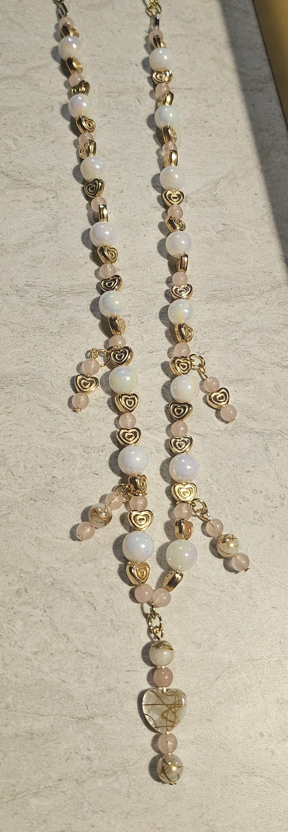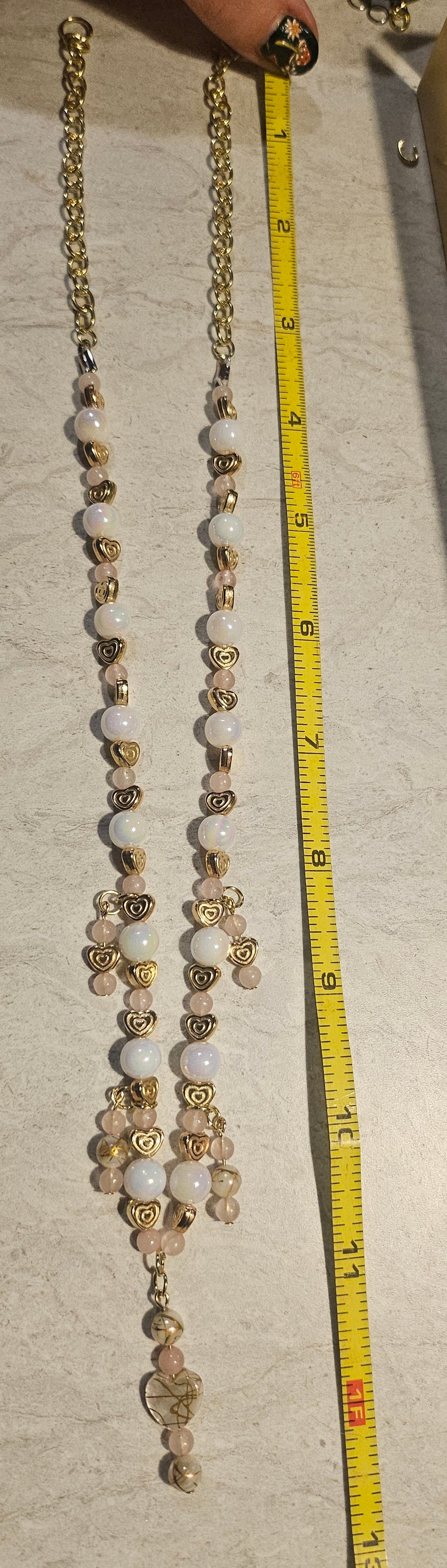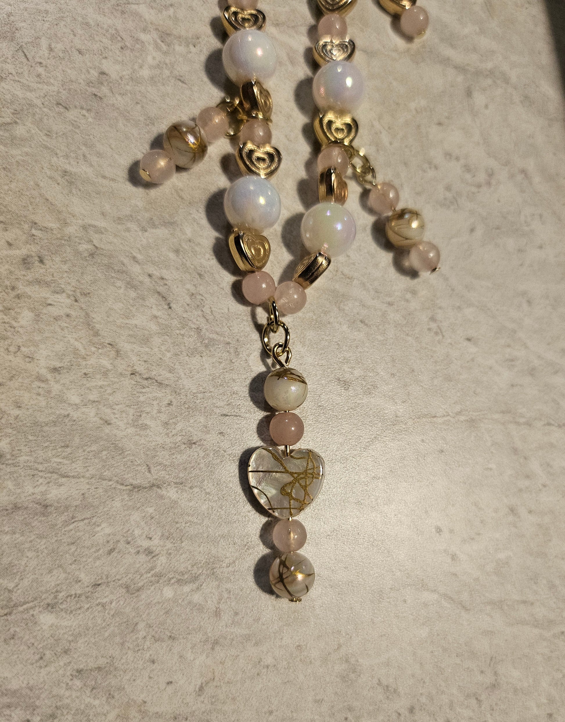 An 11" beaded necklace featuring faux pearl beads spaced with rose quartz. The main charm is an abolone heart and the others are gold/white beads.