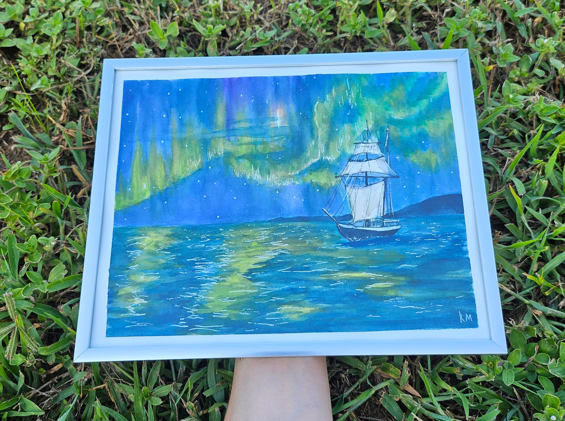 An 8x10 original watercolor painting of a sailboat under the Aurora Borealis at night. In an 8x10 silver plastic frame, can sit or hang on the wall.