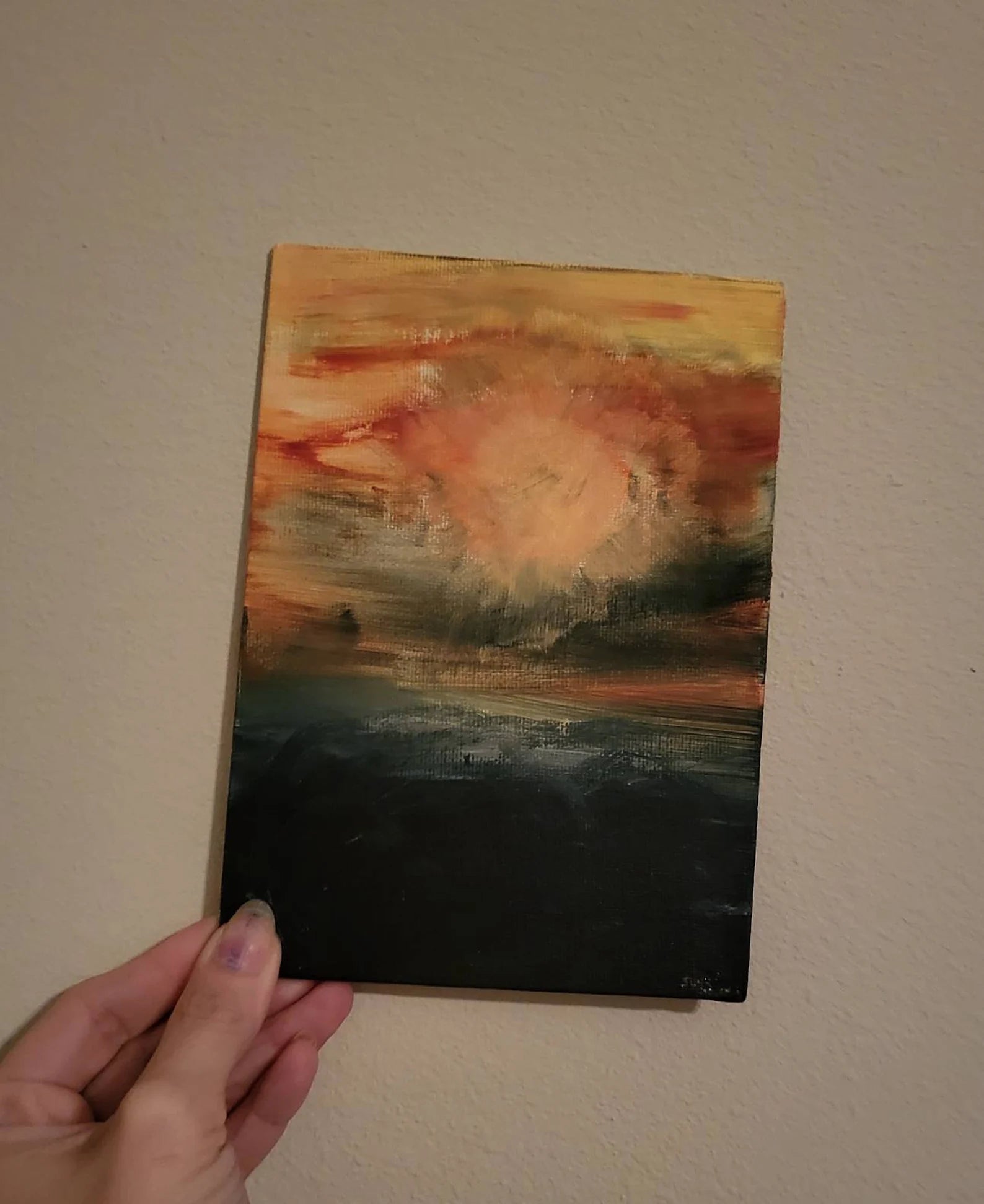 A blue and orange sunset, acrylic on a 5x7 canvas panel.