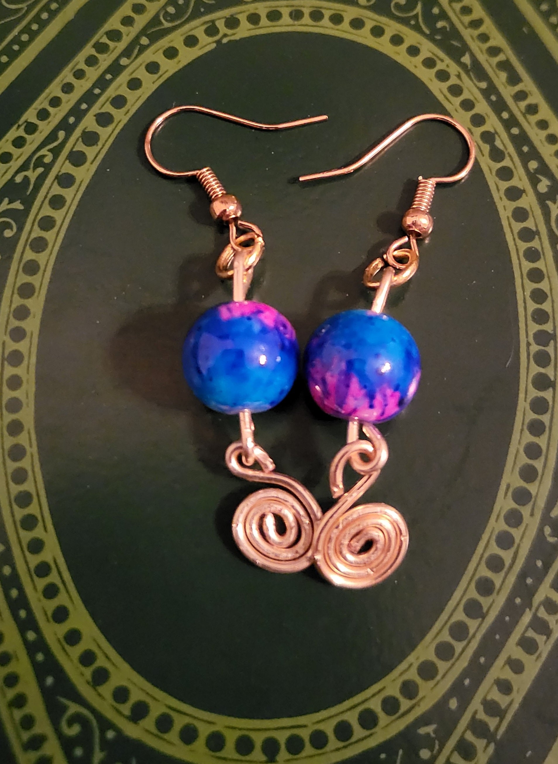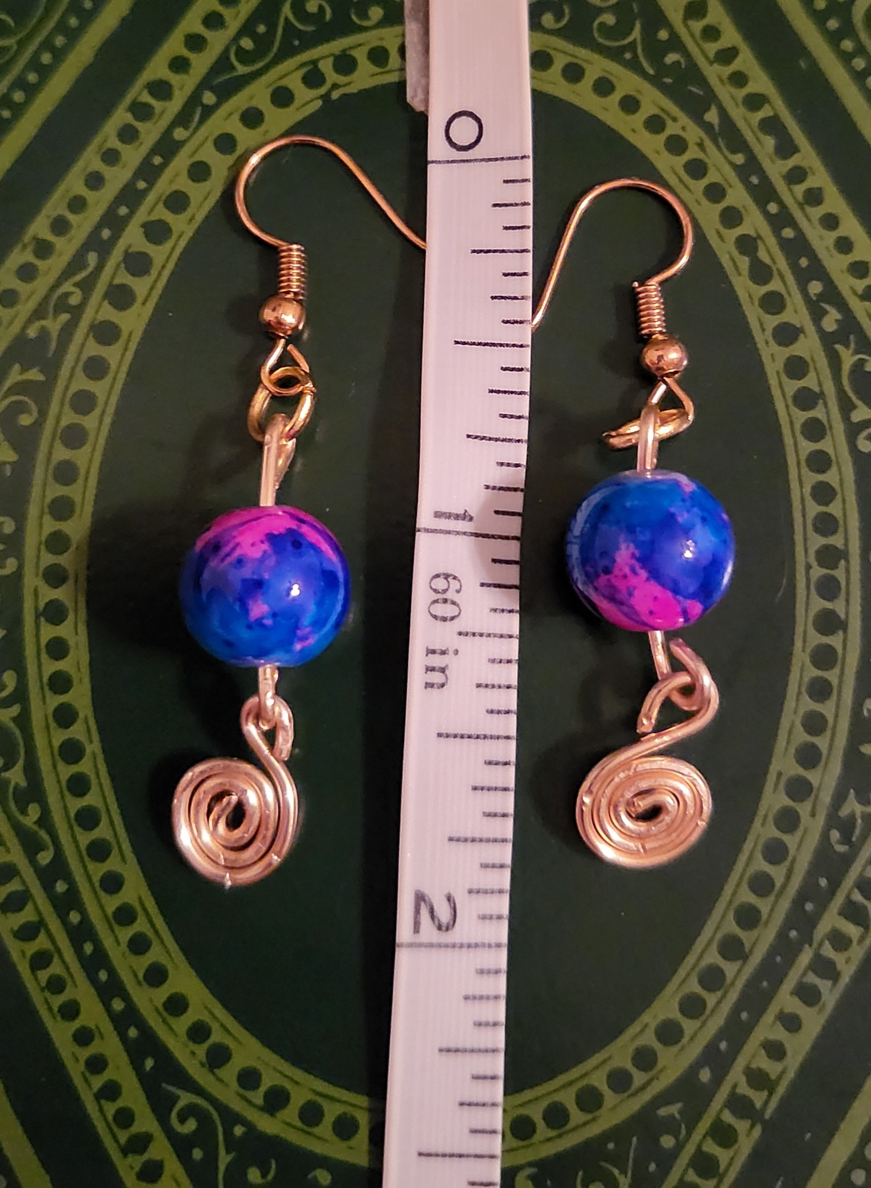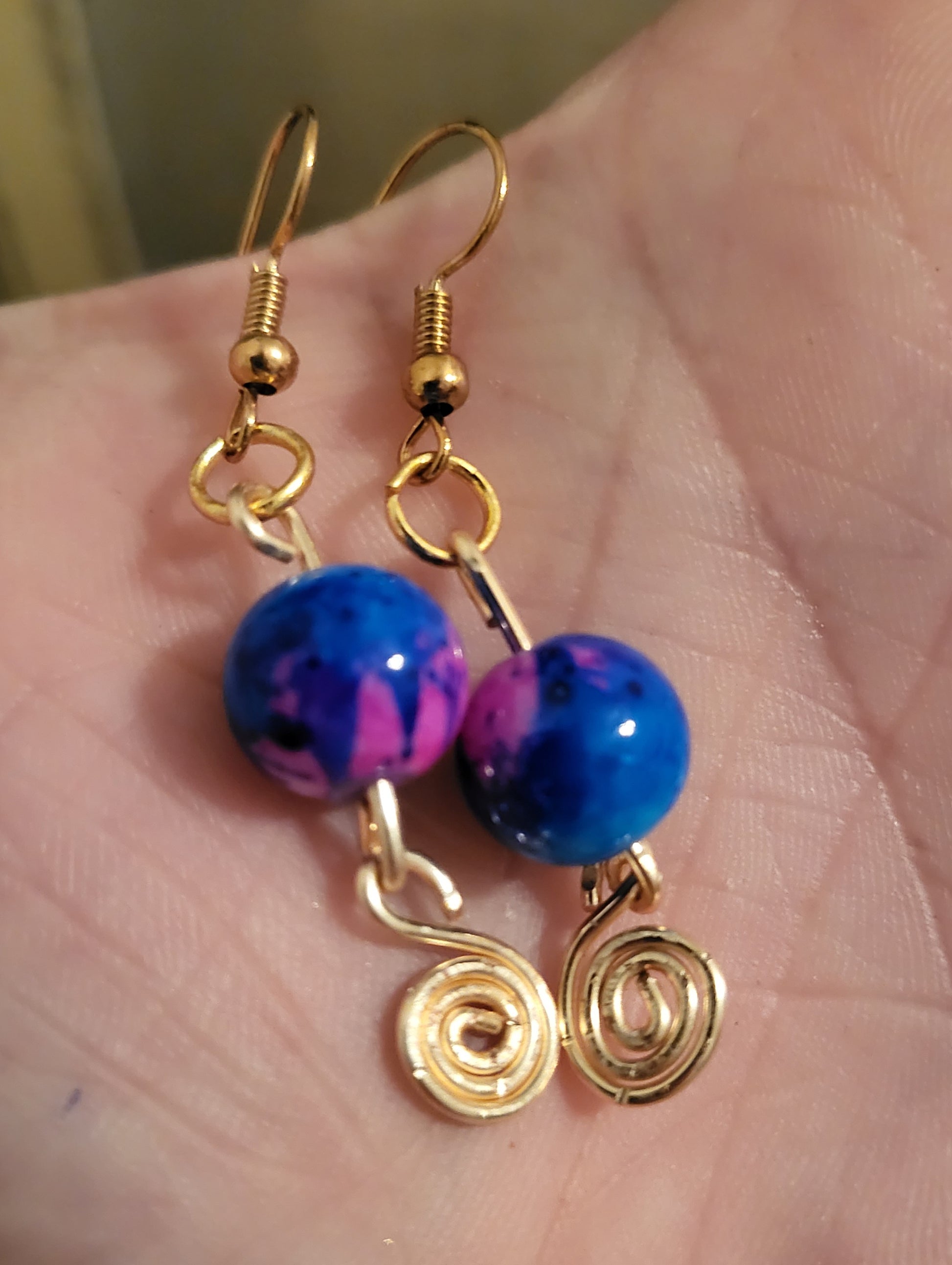 A pair of 2" earrings with fuchsia and blue swirled beads with a gold dangly swirl on fishhook earrings.