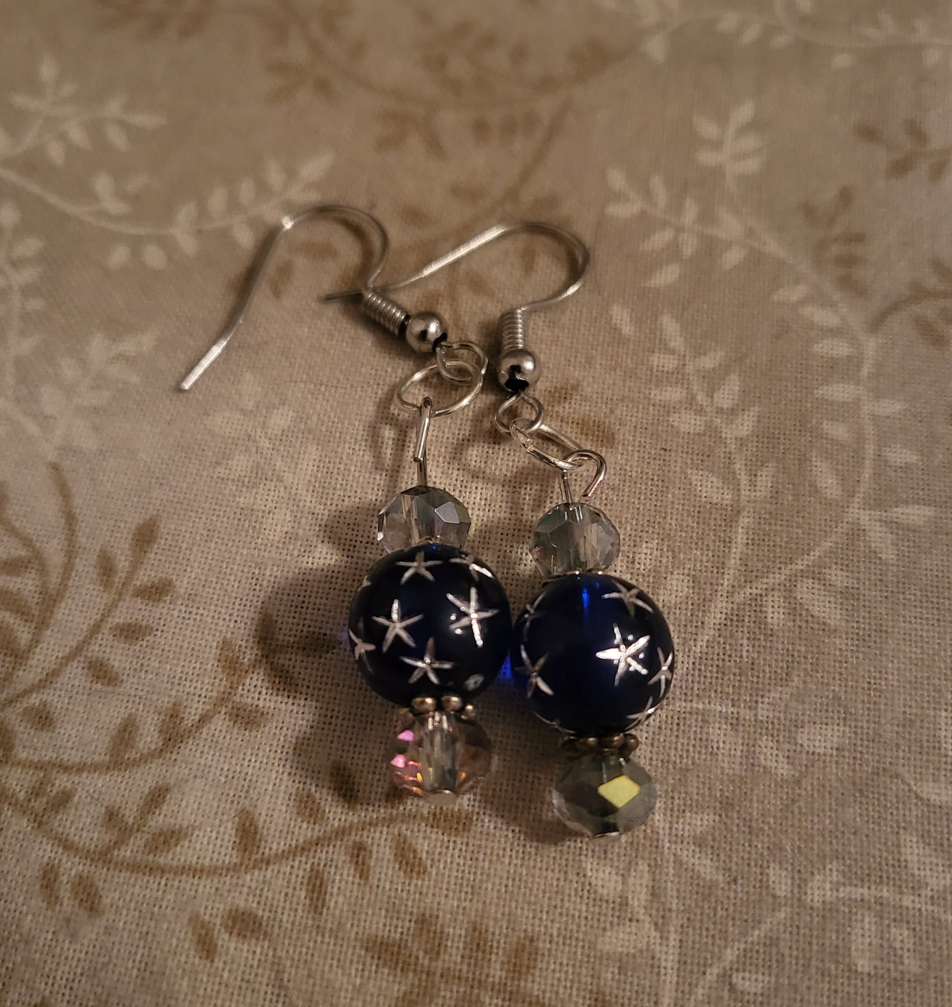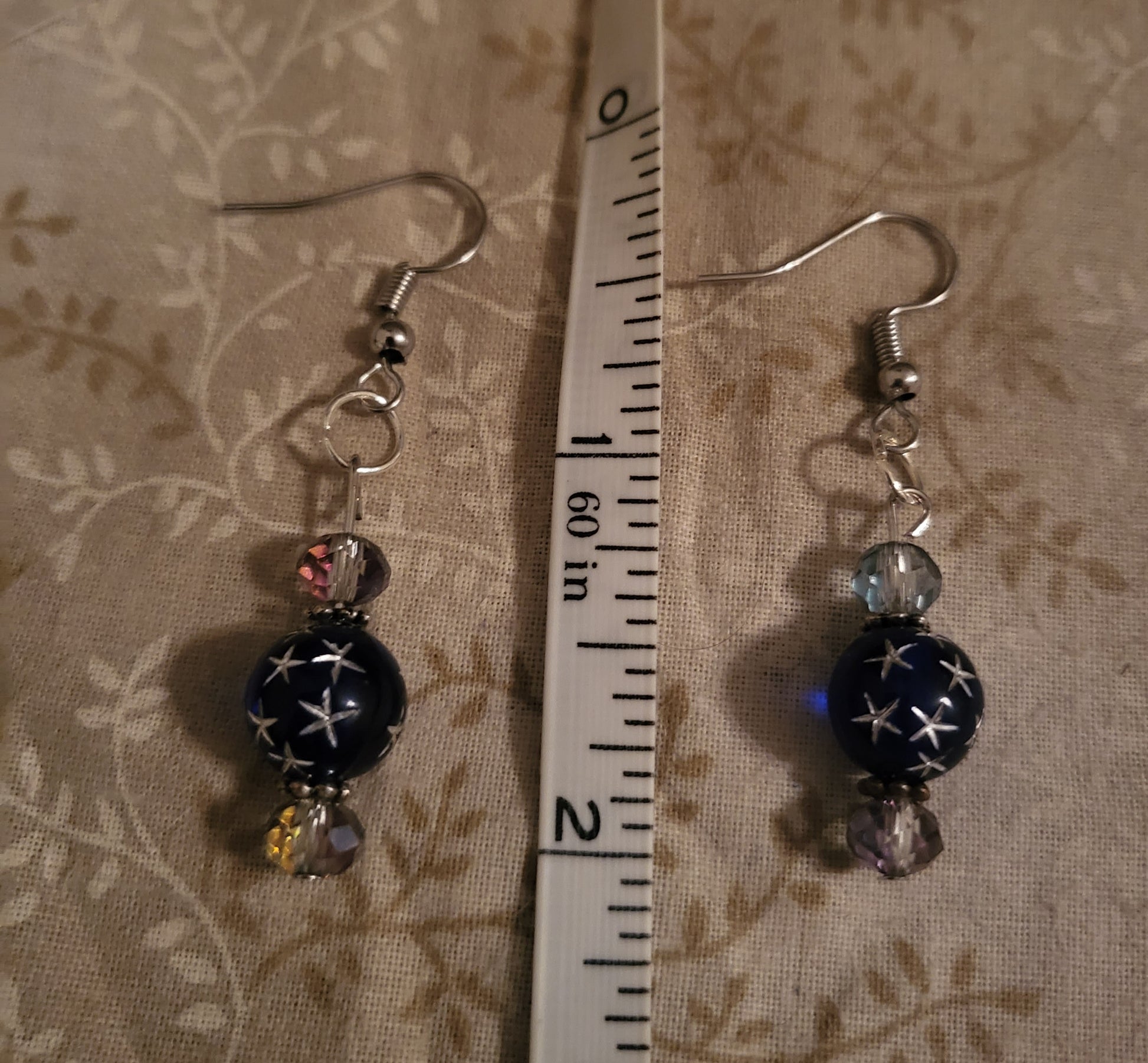 A pair of 2" inch dangly earrings on silver wire with blue beads and iridescent spacers. Earrings are fishook with clear backs.