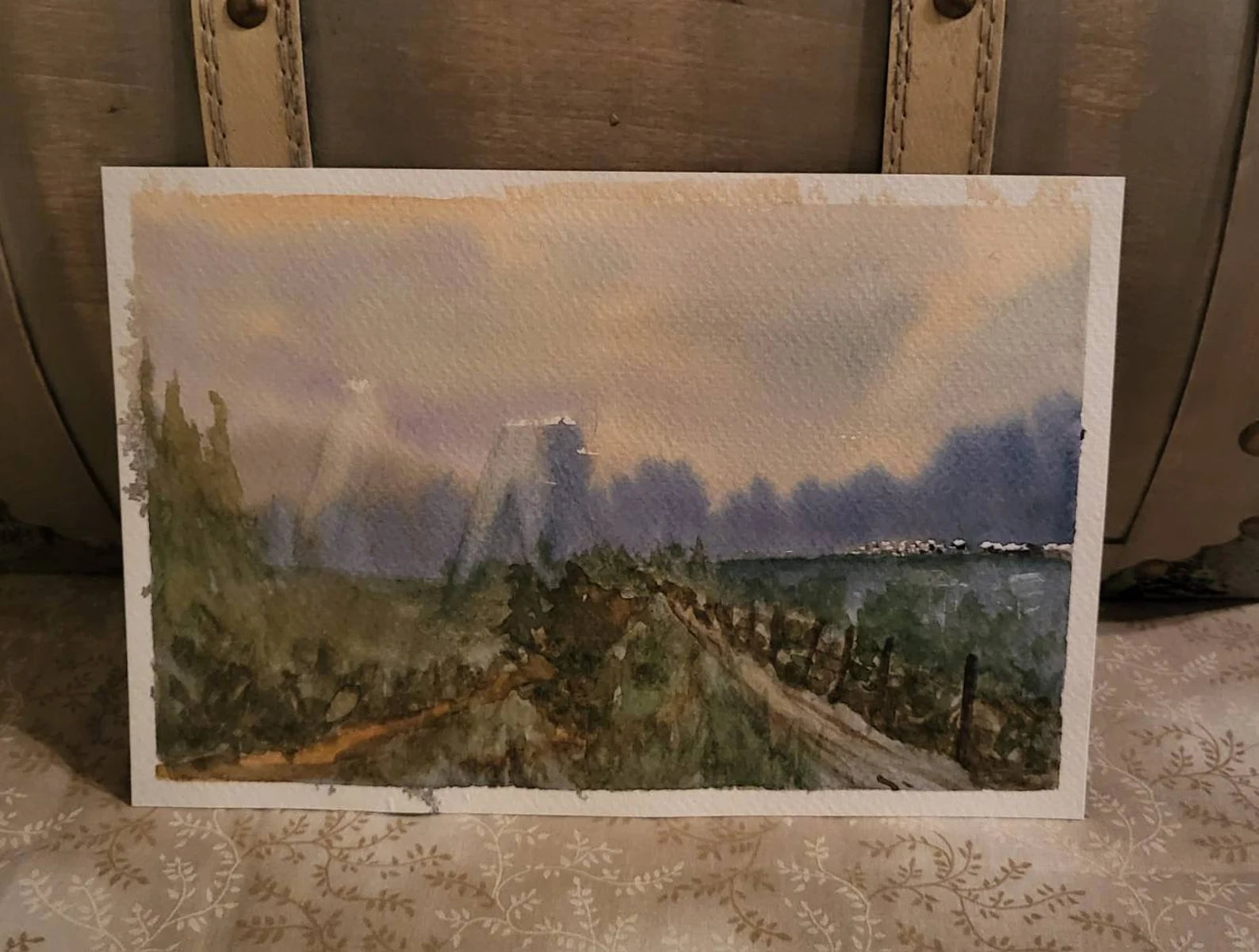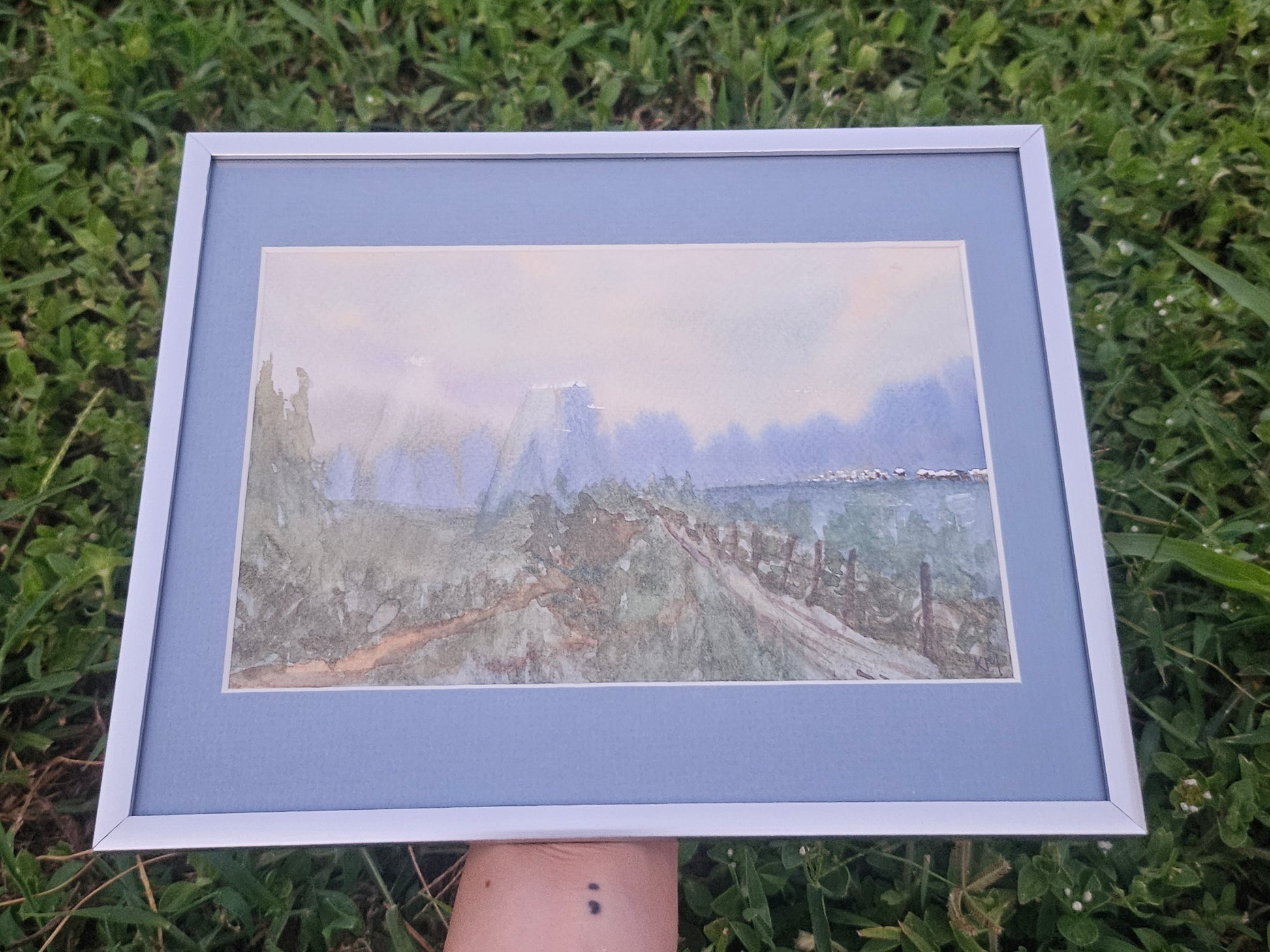A 6 x 9 original watercolor painting of a field with a soft blue morning light. It's matted with a light blue acid free mat into an 8x10 silver frame. The frame can sit or hang on the wall.
