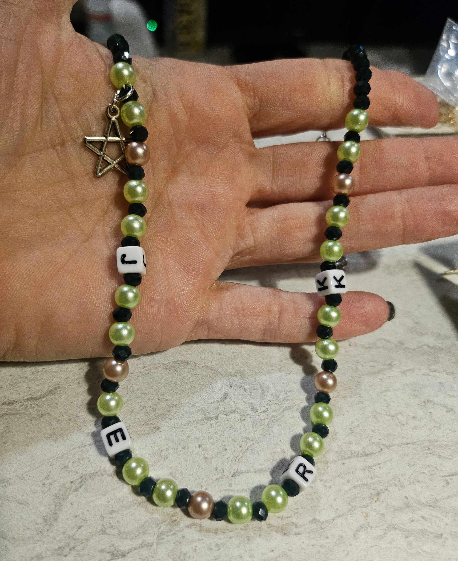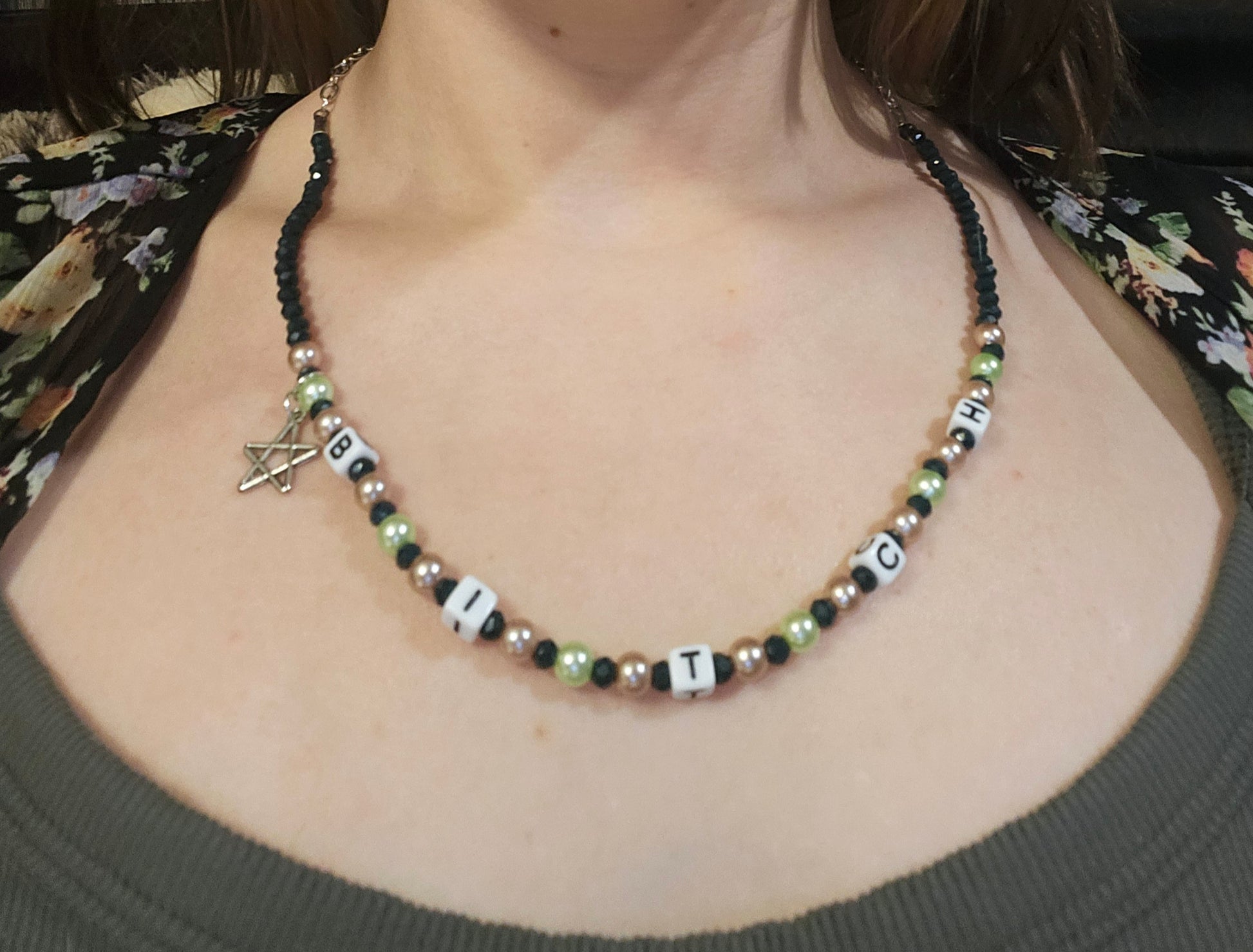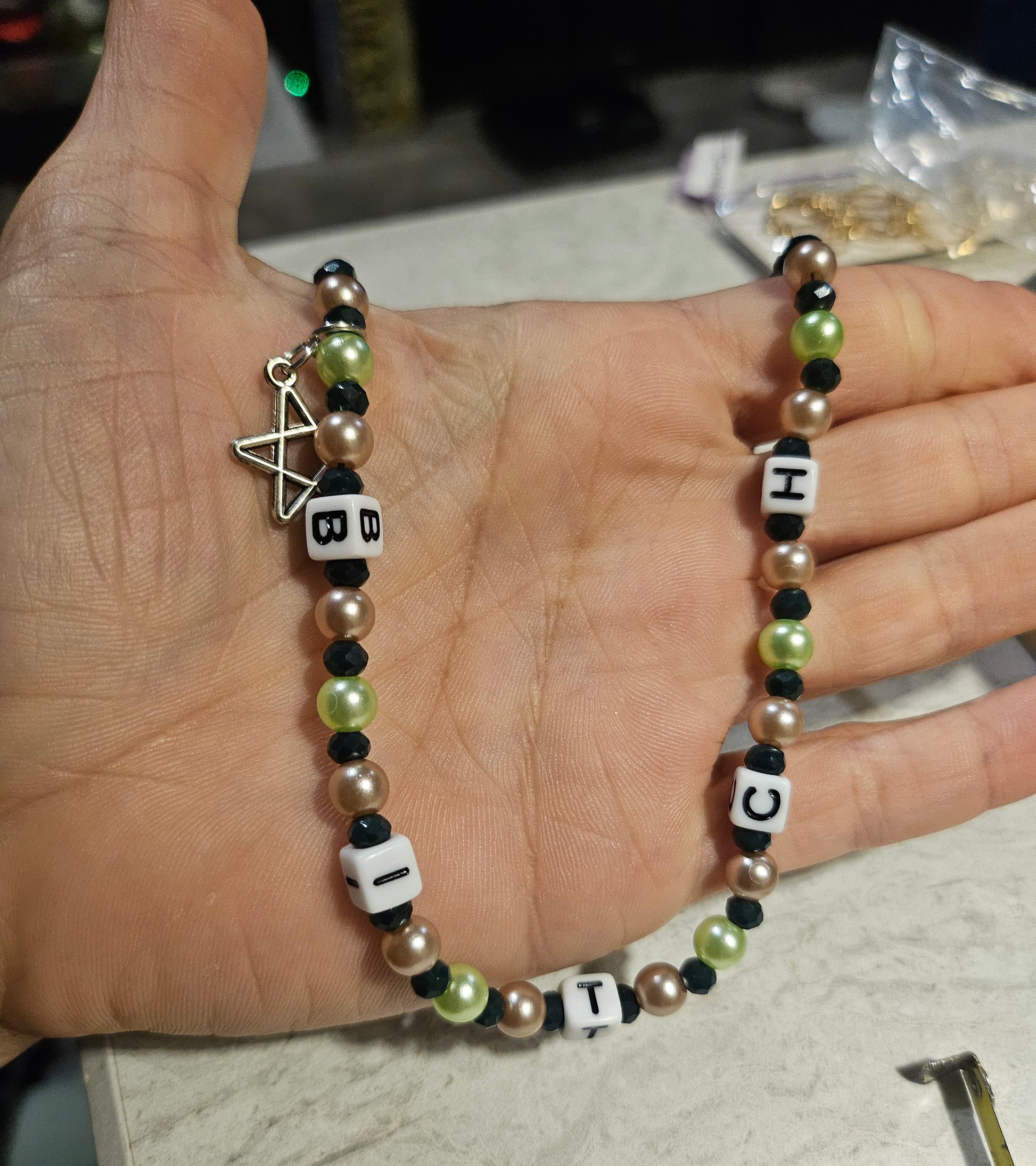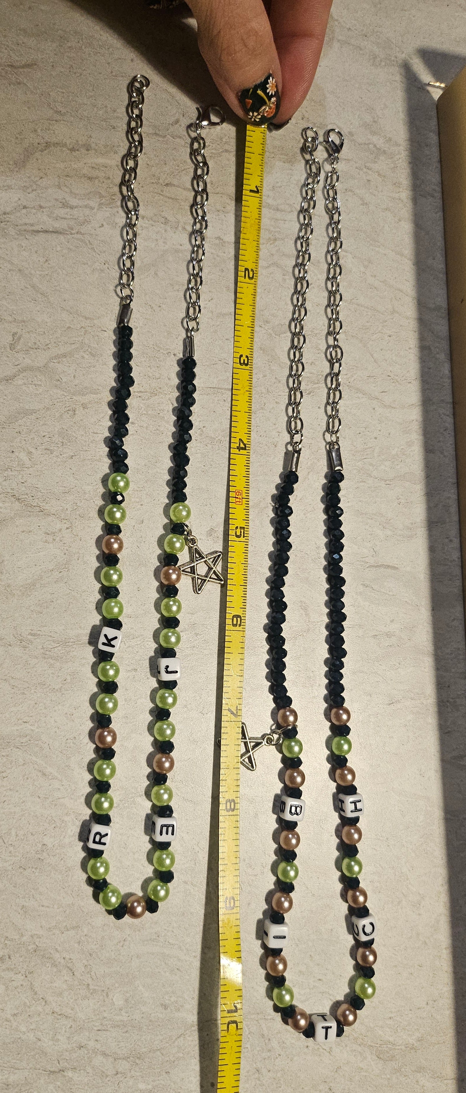 A set of matching necklaces for your bitch or jerk. Cream and green plastic beads with square letter beads spelling 'bitch' and 'jerk'. Jerk is 9" and Bitch is 10", both have lobster clasps and a star charm.