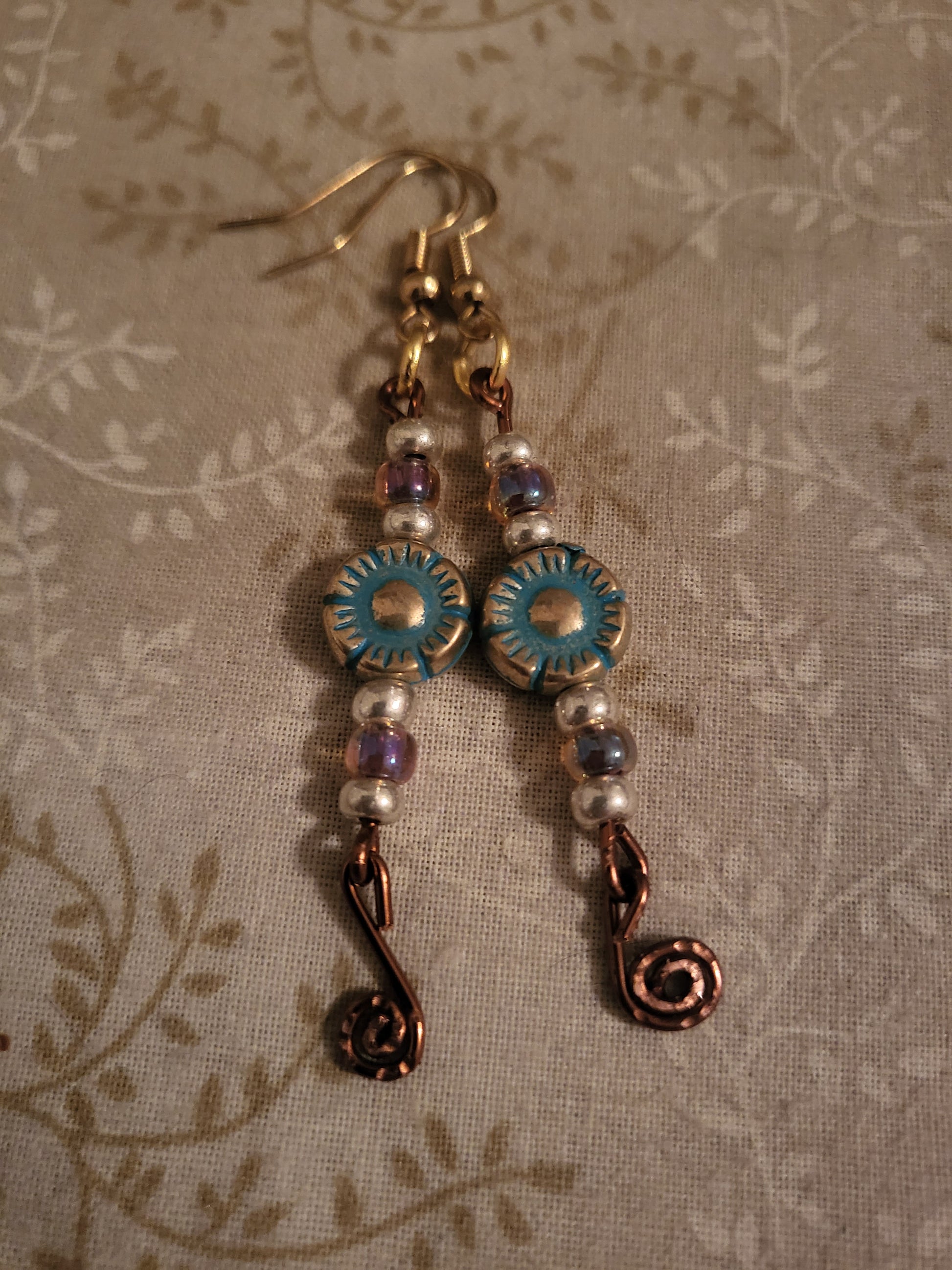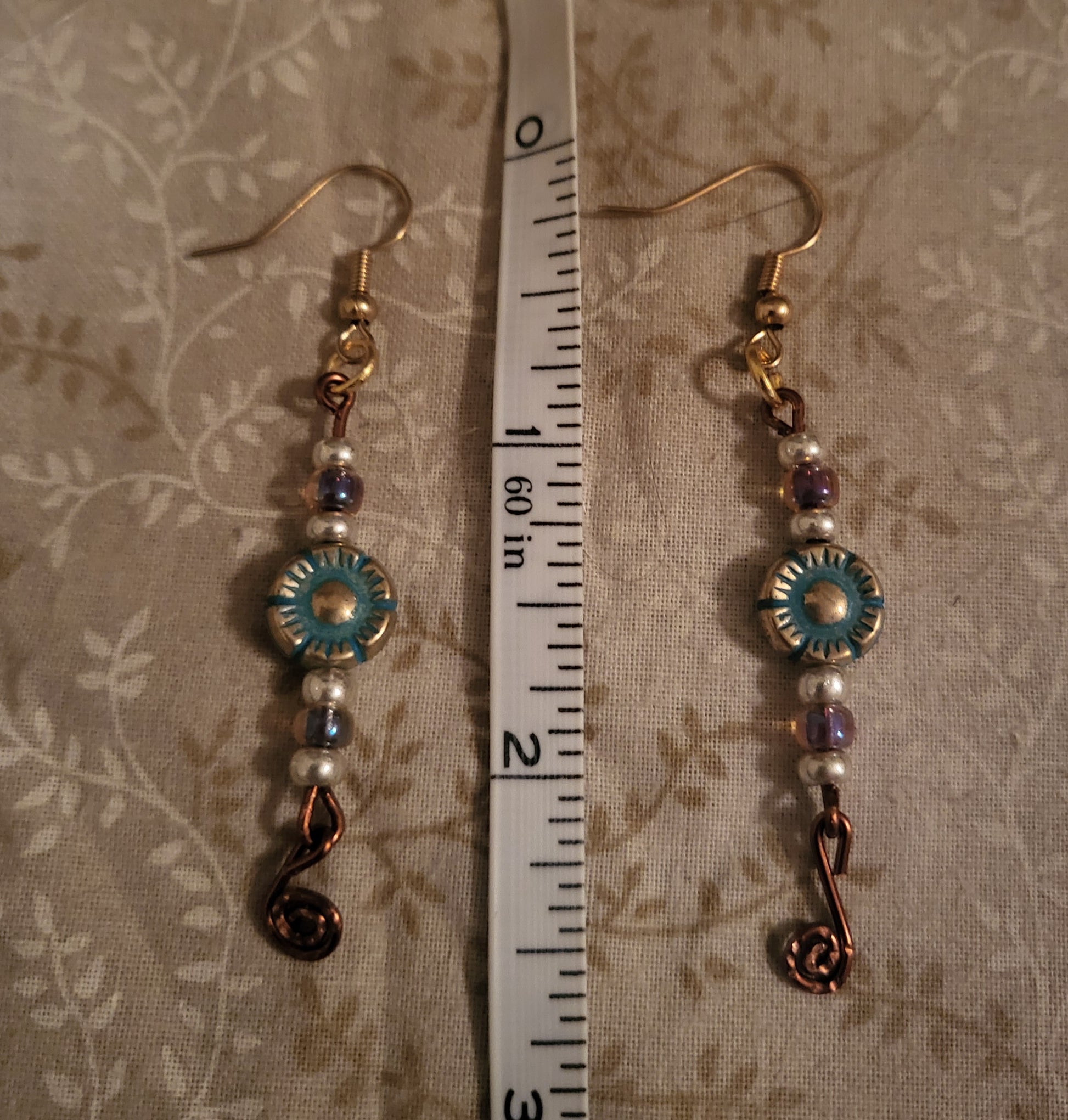 A pair of 2.5" inch dangly earrings on copper with teal flower and iridescent beads. Earrings are fishook with clear backs.