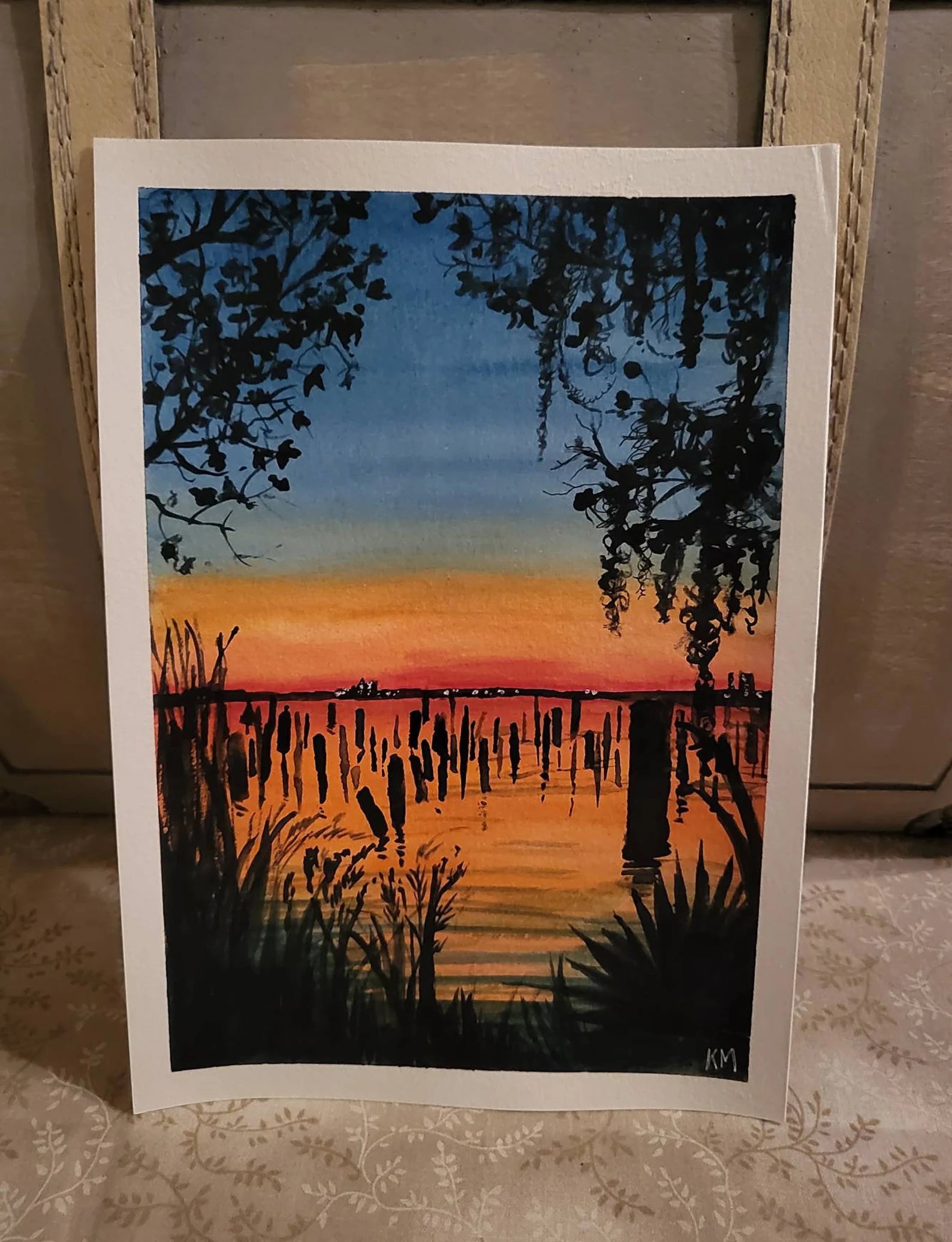 A 6 x 9 original watercolor painting of a Daphne, AL sunset. A Dark blue sky turns to orange and kisses the waterline. The reeds and plants are shadowed by the approaching dusk.