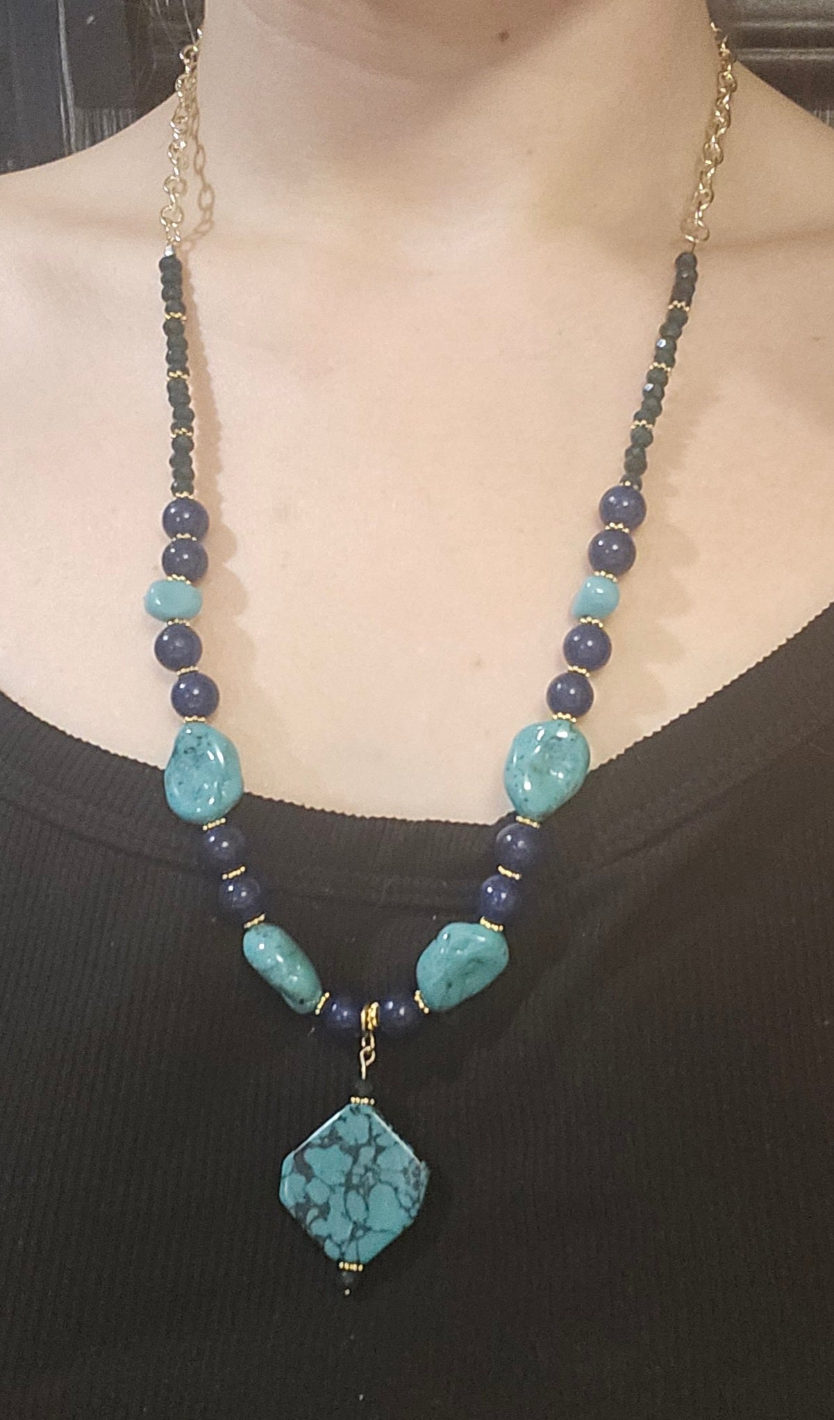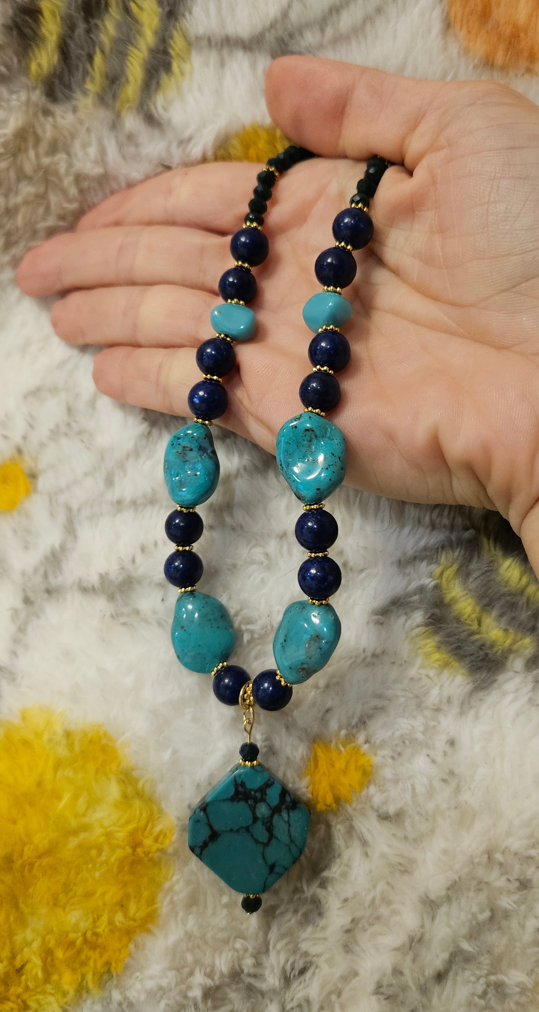 An eleven inch lobster clasp necklace featuring an irregular turquoise bead on and eyepin. Plastic turquoise colord beads are spaced with 8mm lapis lazuli.