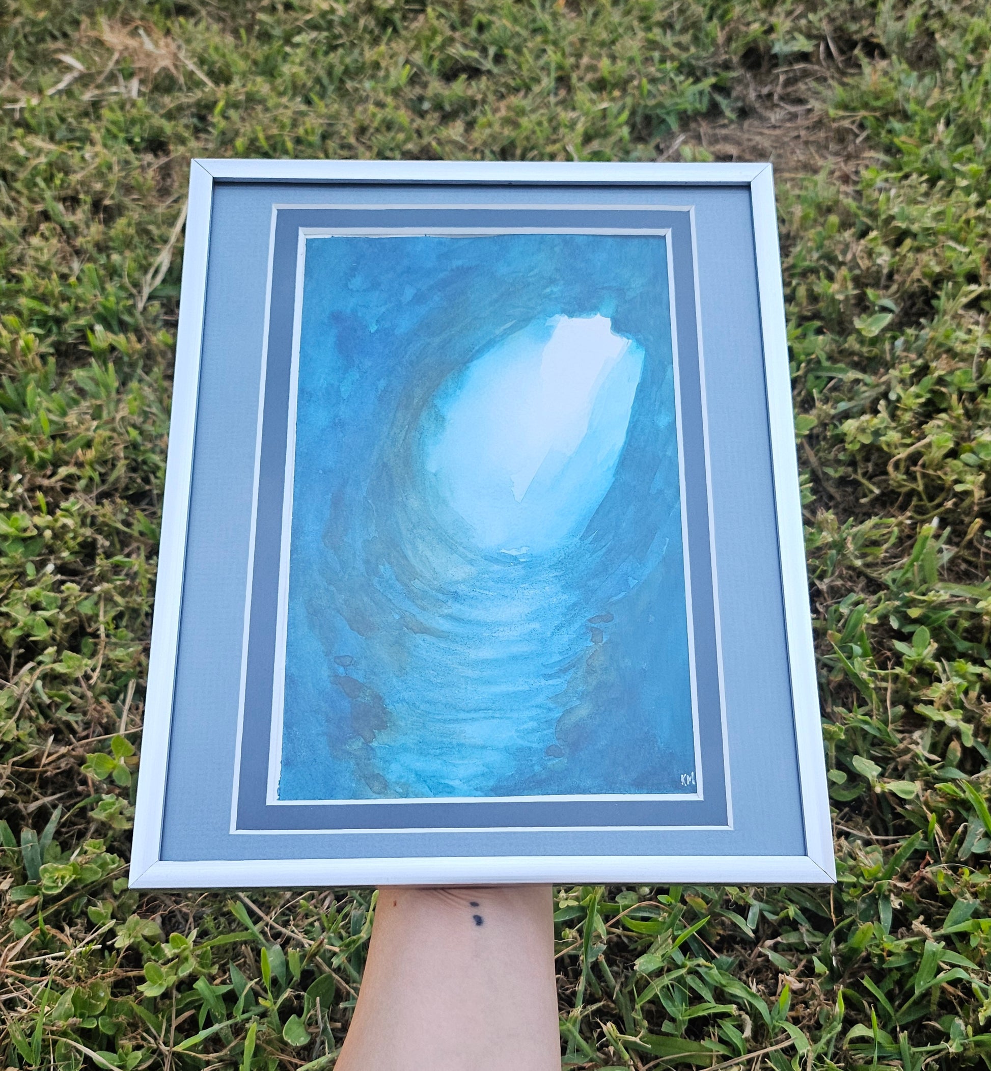 A 6 x 9 original watercolor painting of an underwater cave, double-matted to fit an 8x10 silver plastic frame. Frame can sit with an arm or hang on the wall.