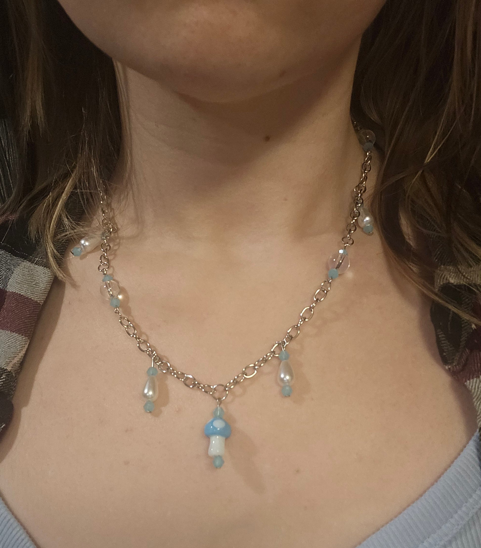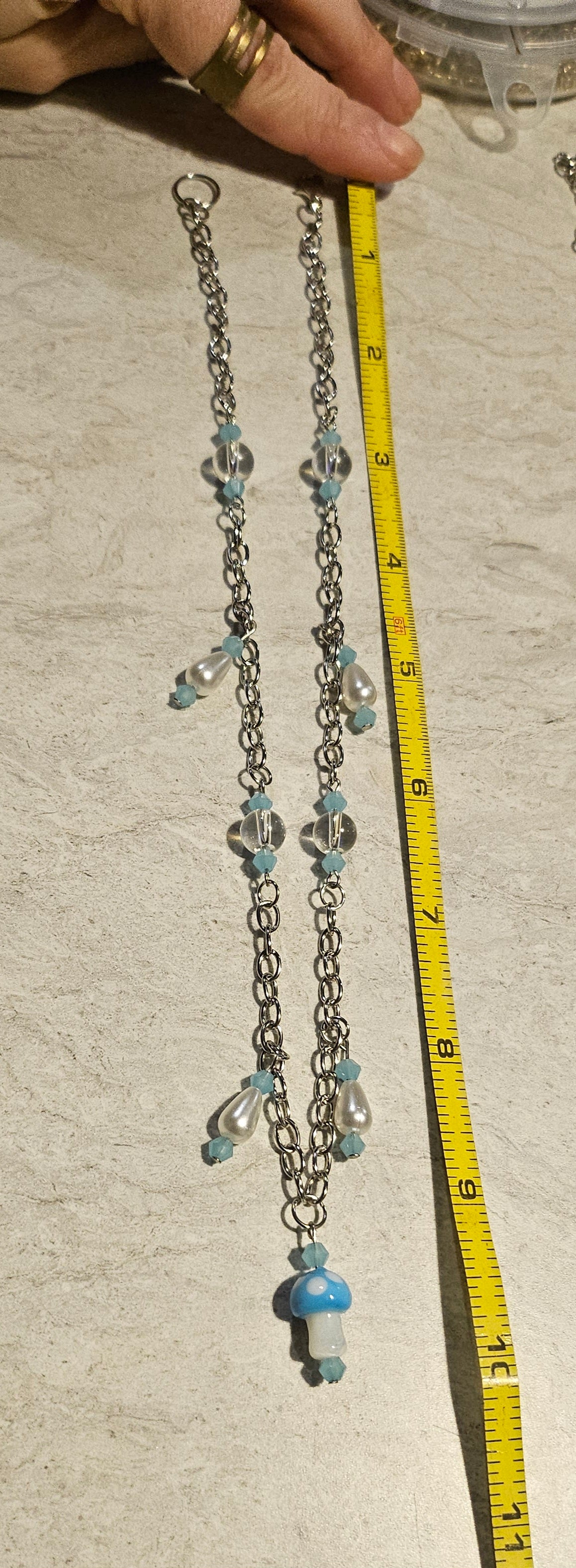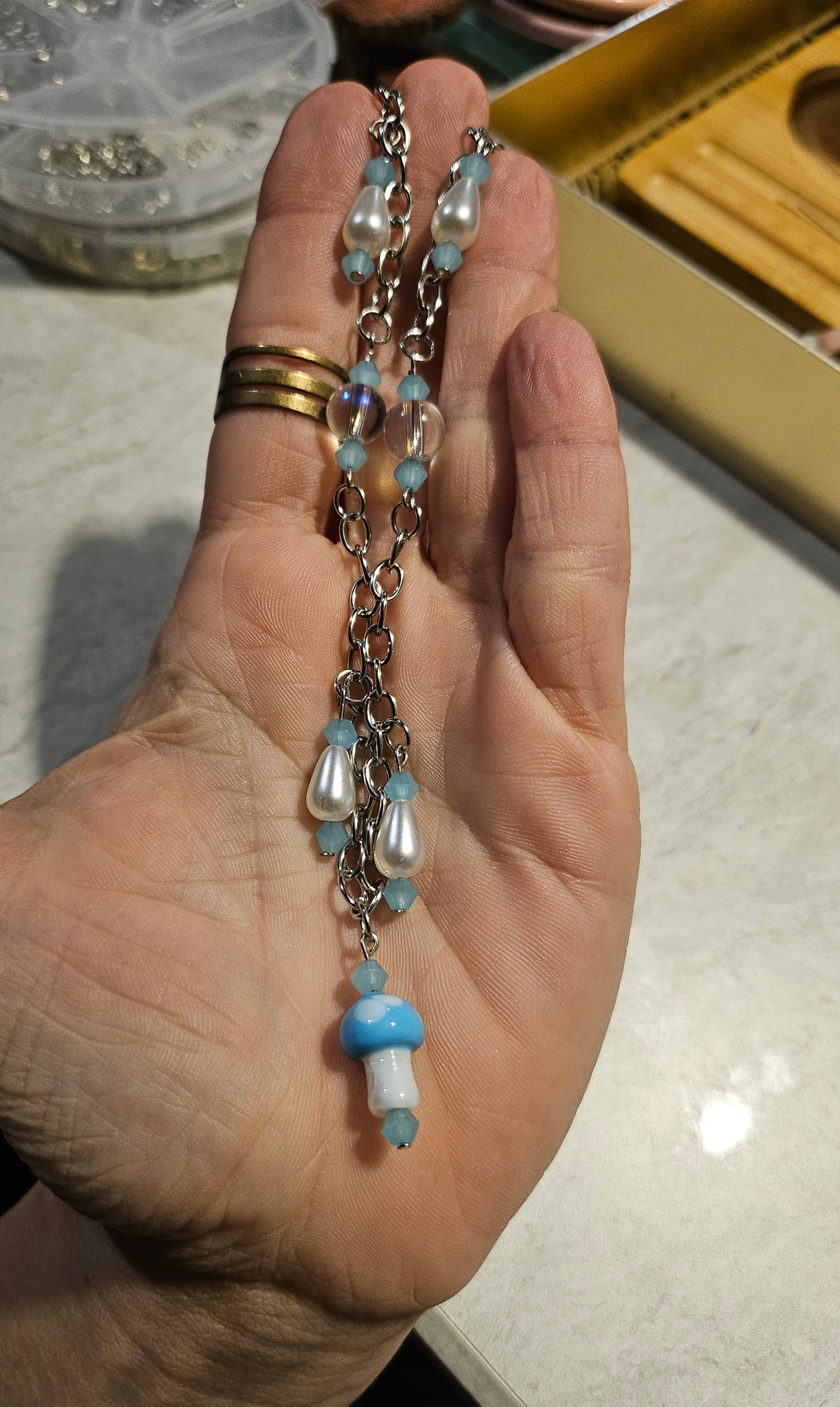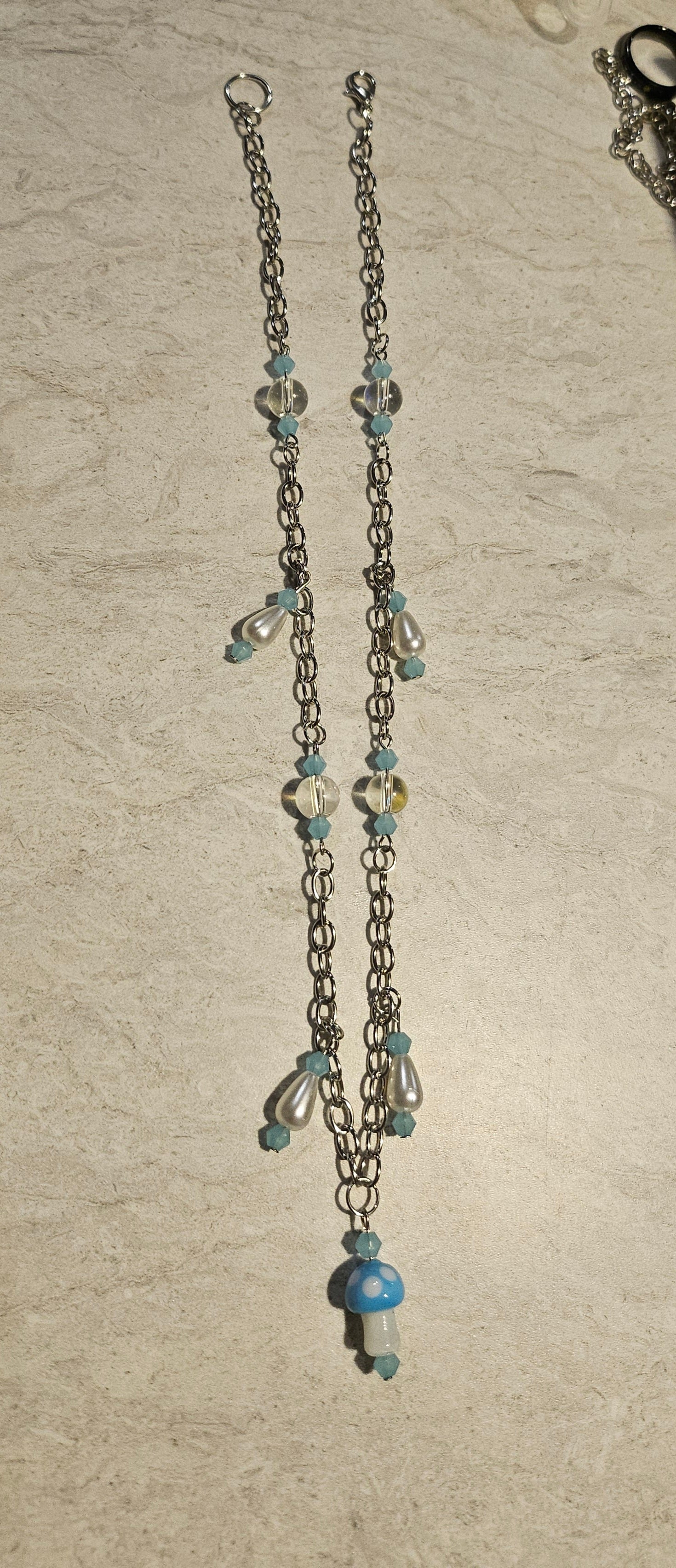 A 10" necklace featuring a cyan glass mushroom and glass iridescent beads soaved with smaller cyan glass beads. Necklace is lobster clasp.
