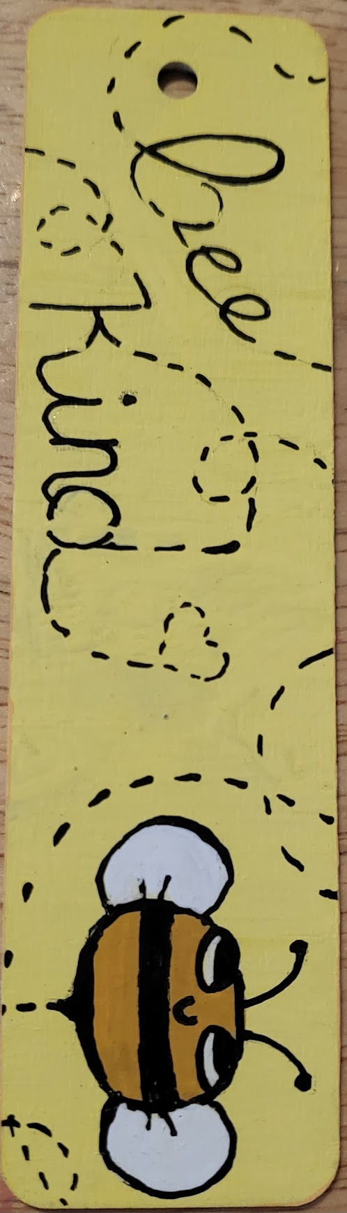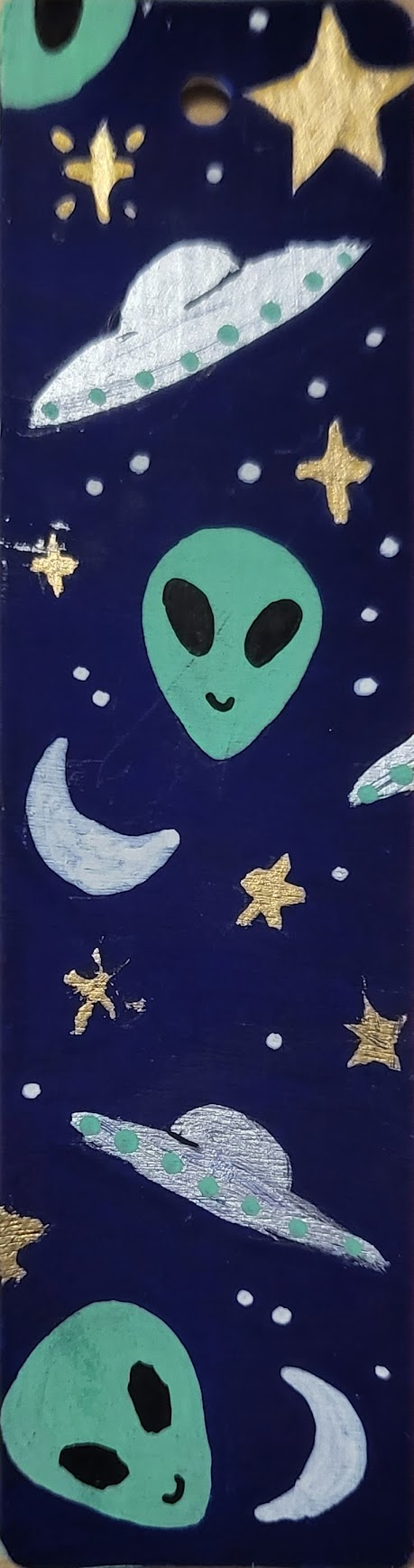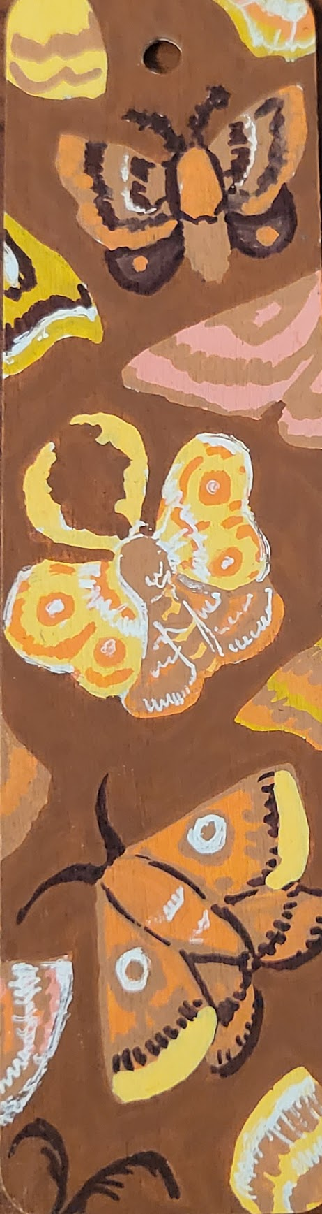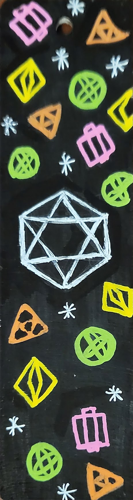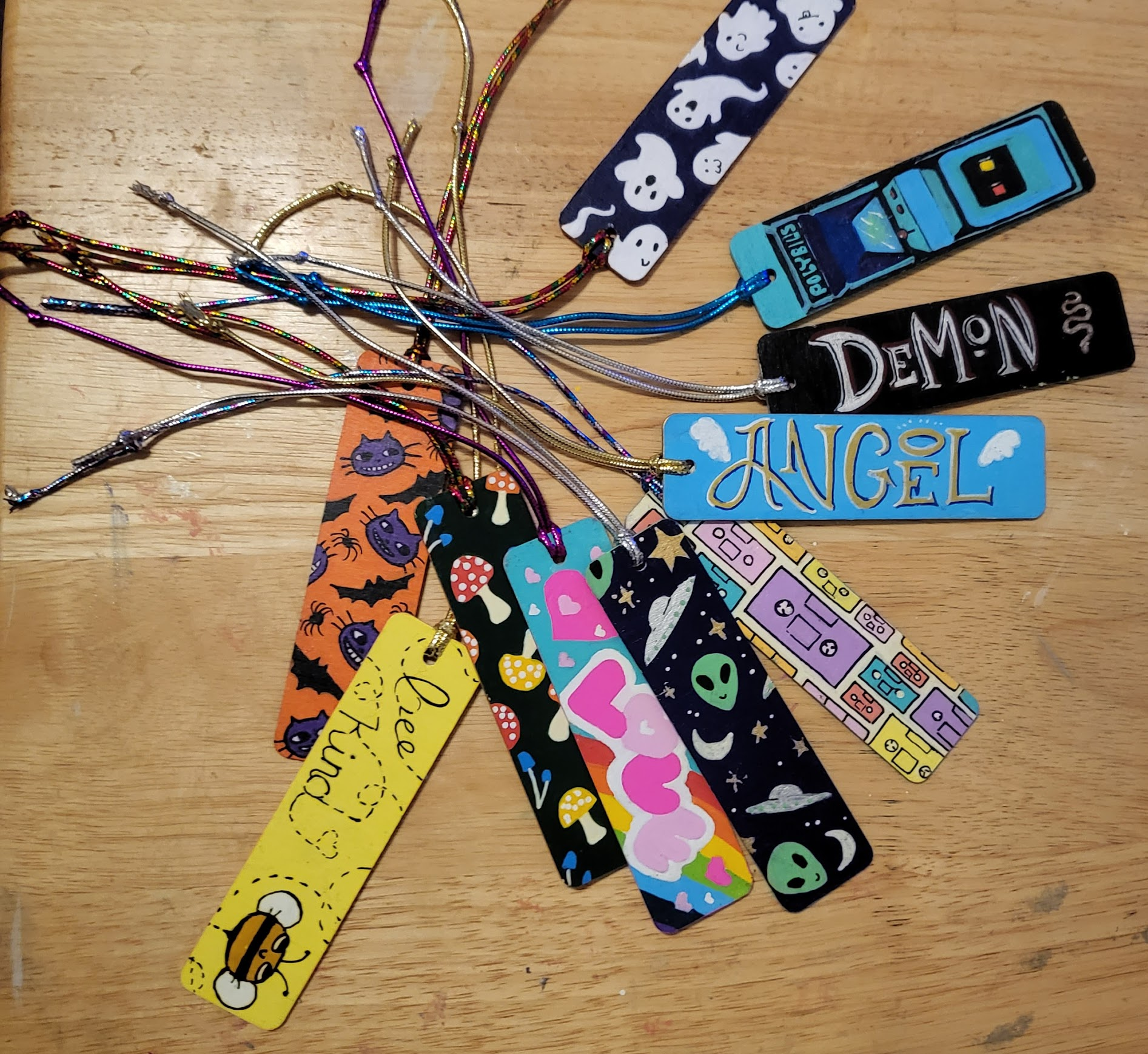 An assortment of POSCA painted wooden bookmarks, each with a metallic cord threaded through the hole at the top to make finding your place easy.