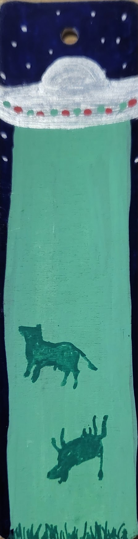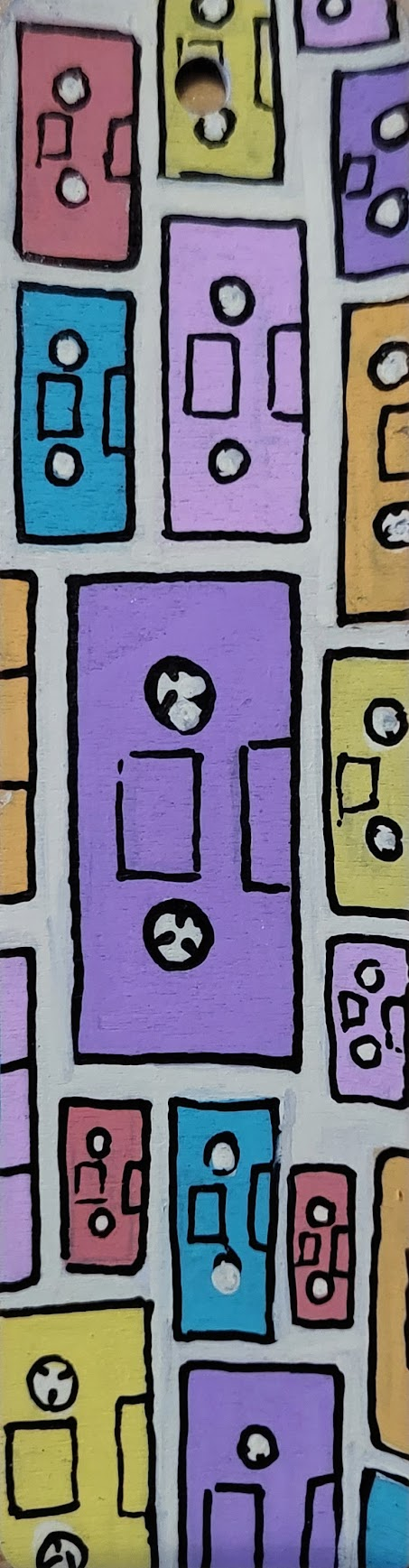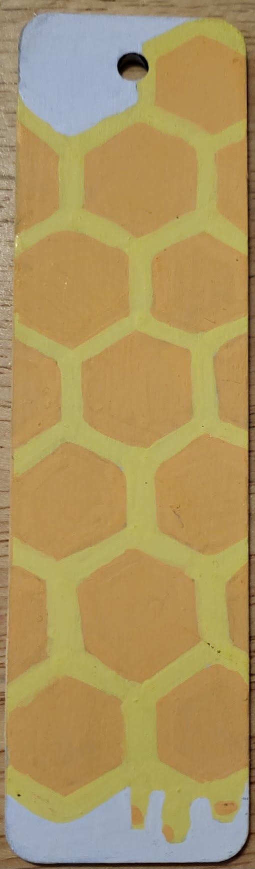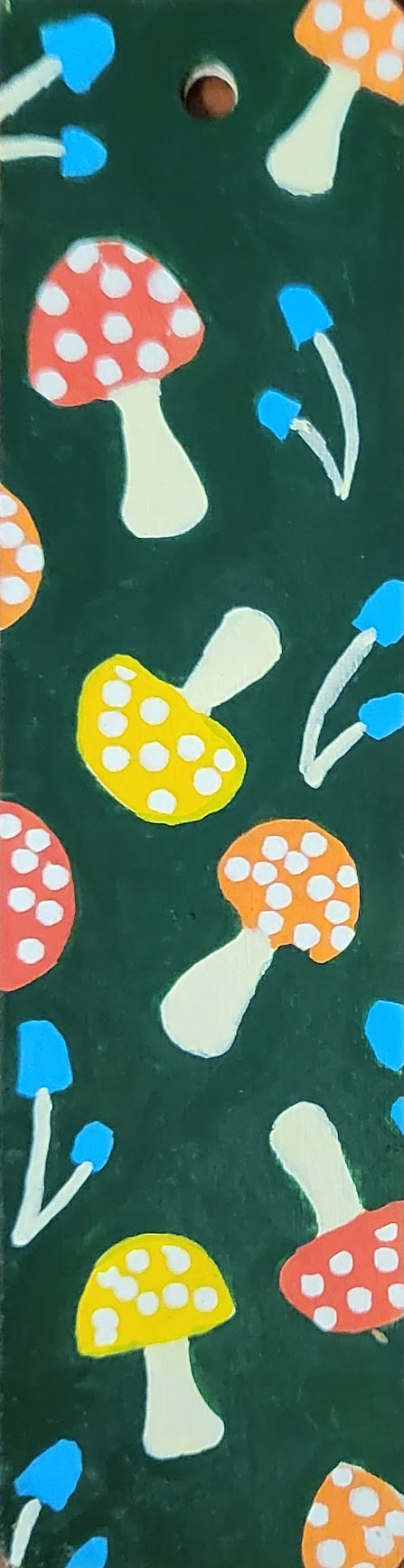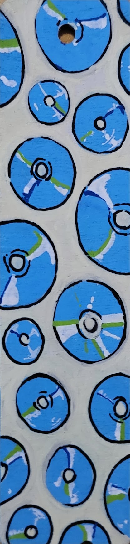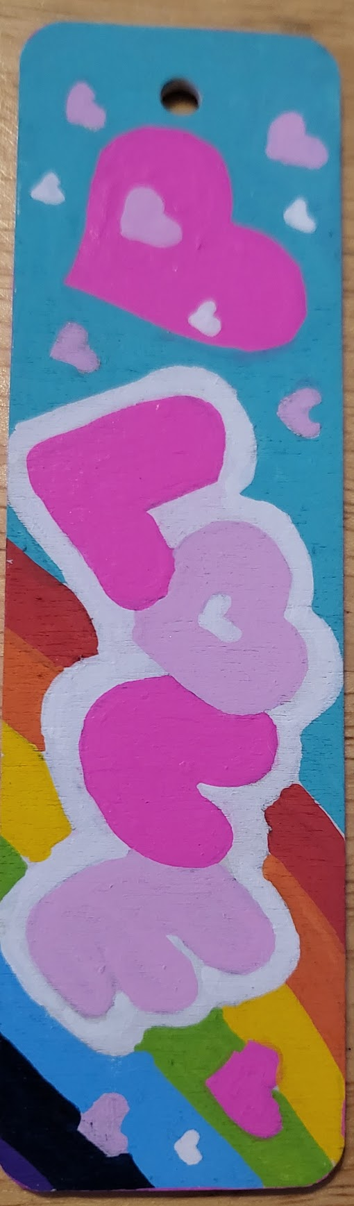 An assortment of POSCA painted wooden bookmarks, each with a metallic cord threaded through the hole at the top to make finding your place easy.