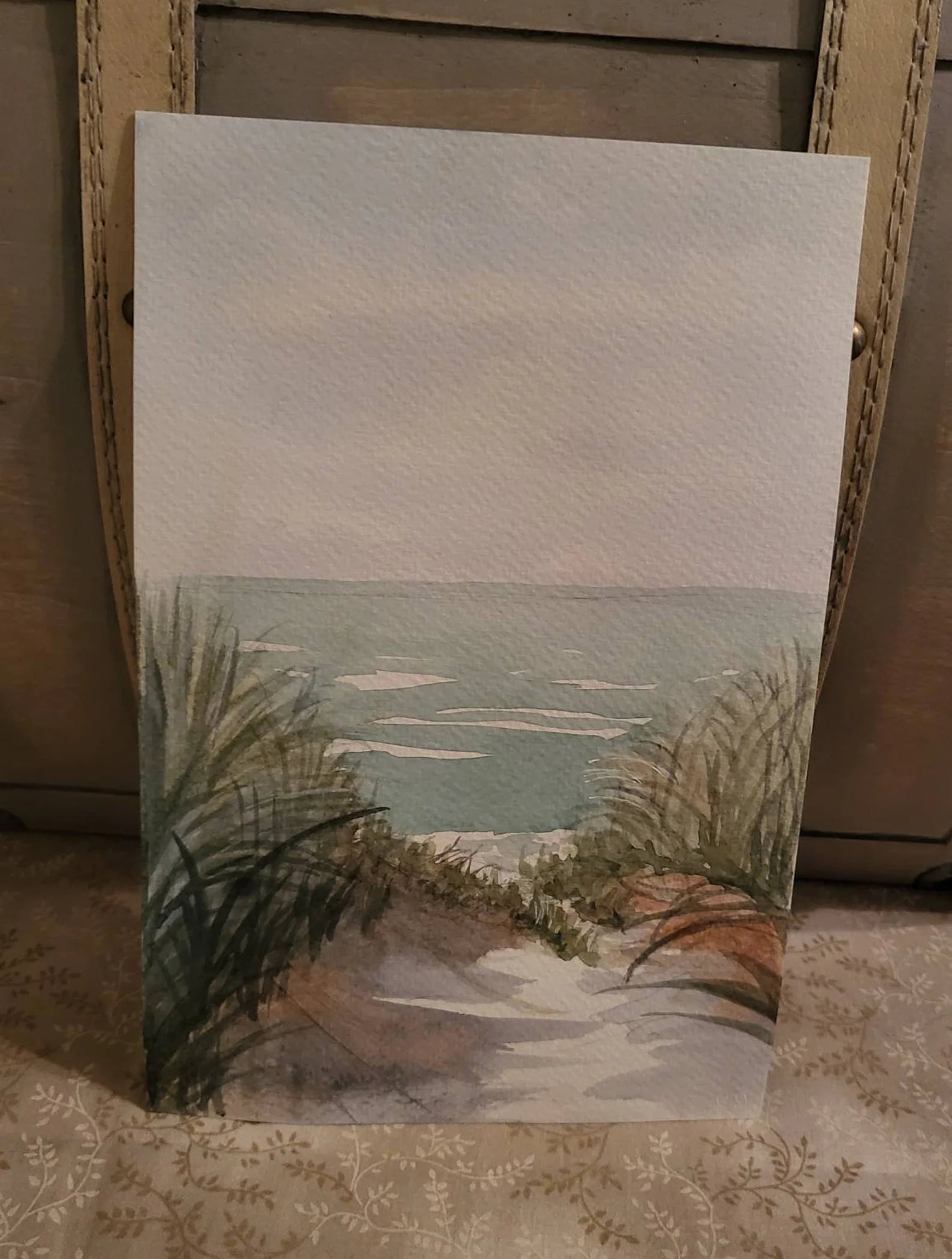 A 6 x 9 original watercolor painting of a waterline view through grasses.