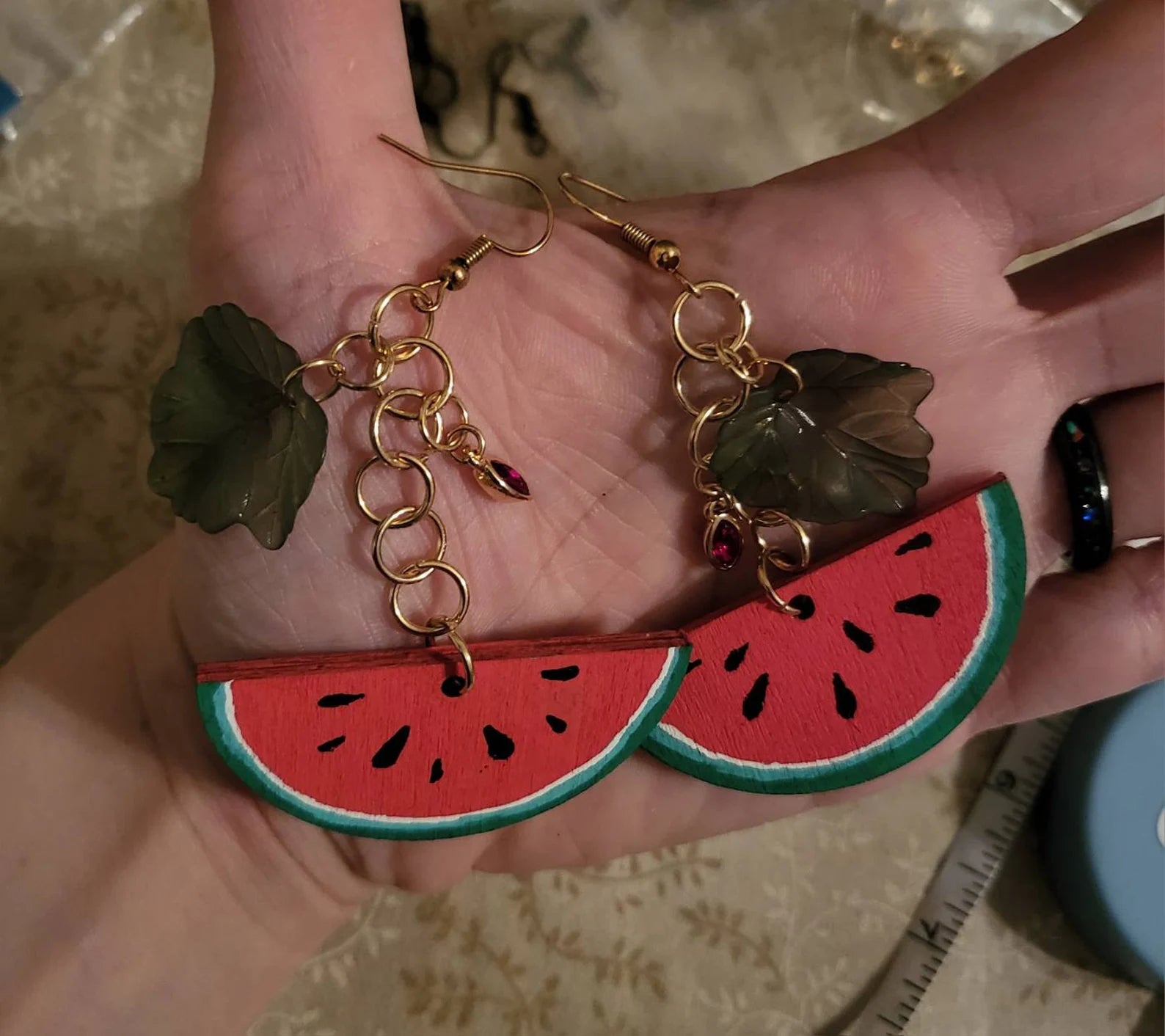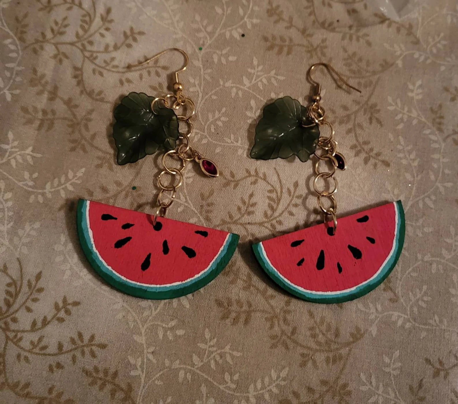 A pair of posca painted Watermelon slices on gold fishhook earrings. Each earring has a dangly green leaf and a red teardrop gem.