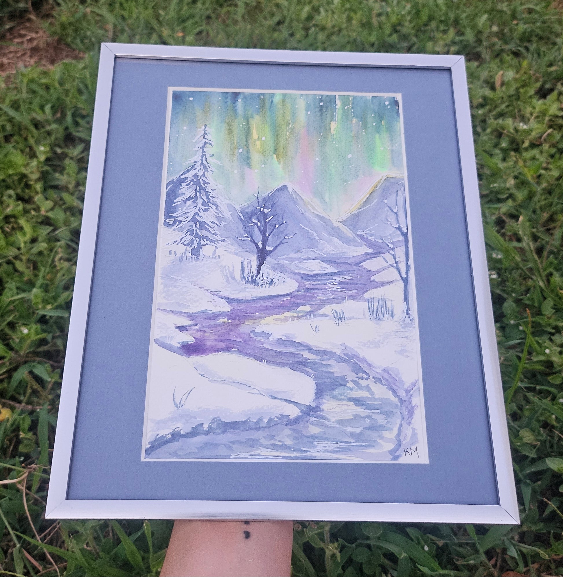 A 6x9 original watercolor of an artic night with green lights reflected in the sky over a river by magicbubblepipe. Matted with nautical blue into a silver frame. Frame can sit or hang on the wall.