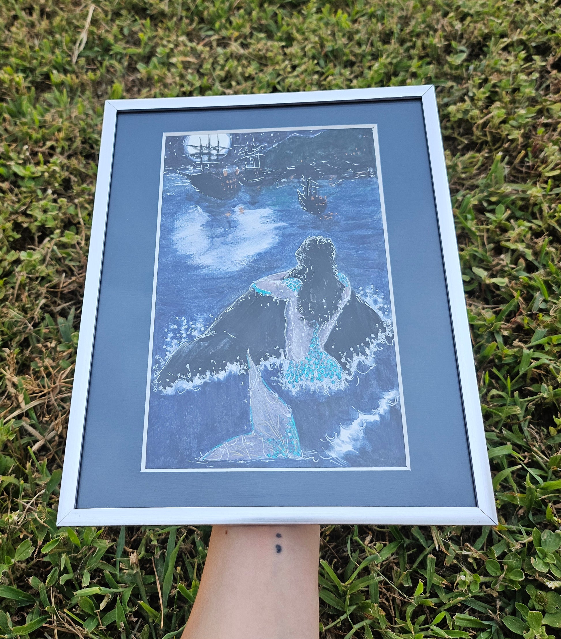 A 6x9 original watercolor of a mermaid watching pirate ships in the moonlight. Matted to git an 8x10 silver frame that can sit or hang.