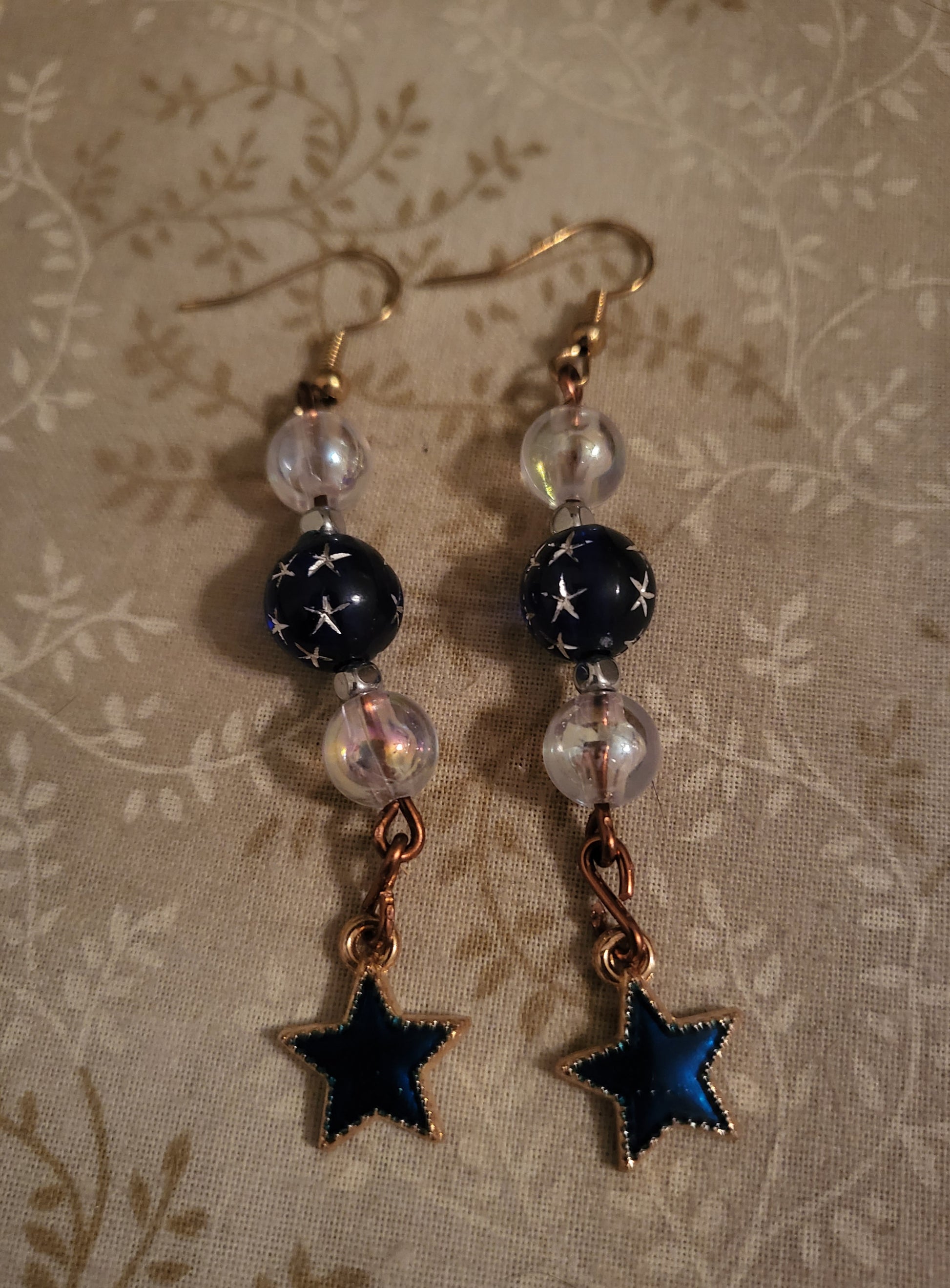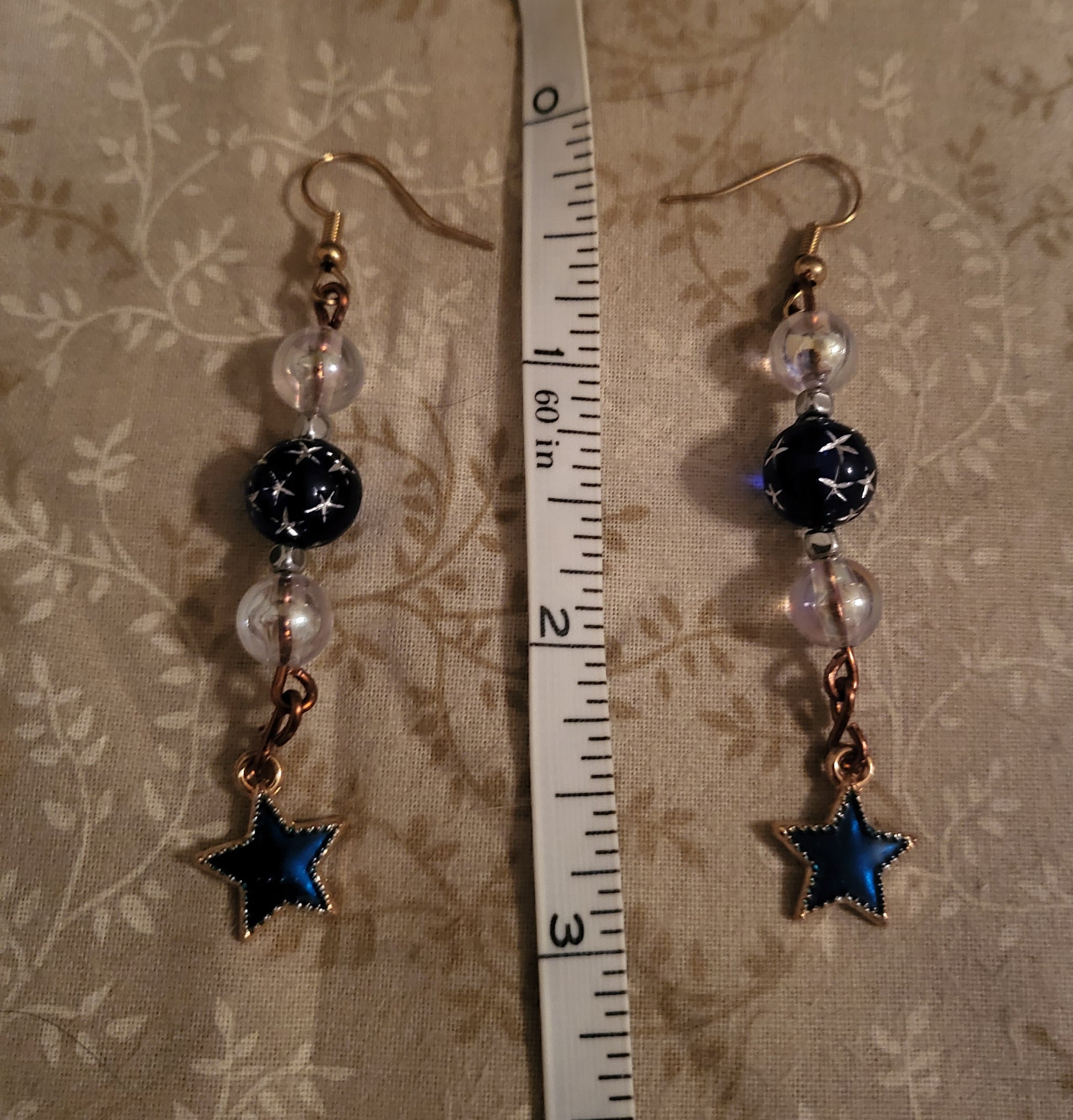 A pair of 3" inch dangly earrings on copper wire with blue star beads and iridescent beads for spacers. Dangly charm is a blue/gree star. Earrings are fishook with clear backs.